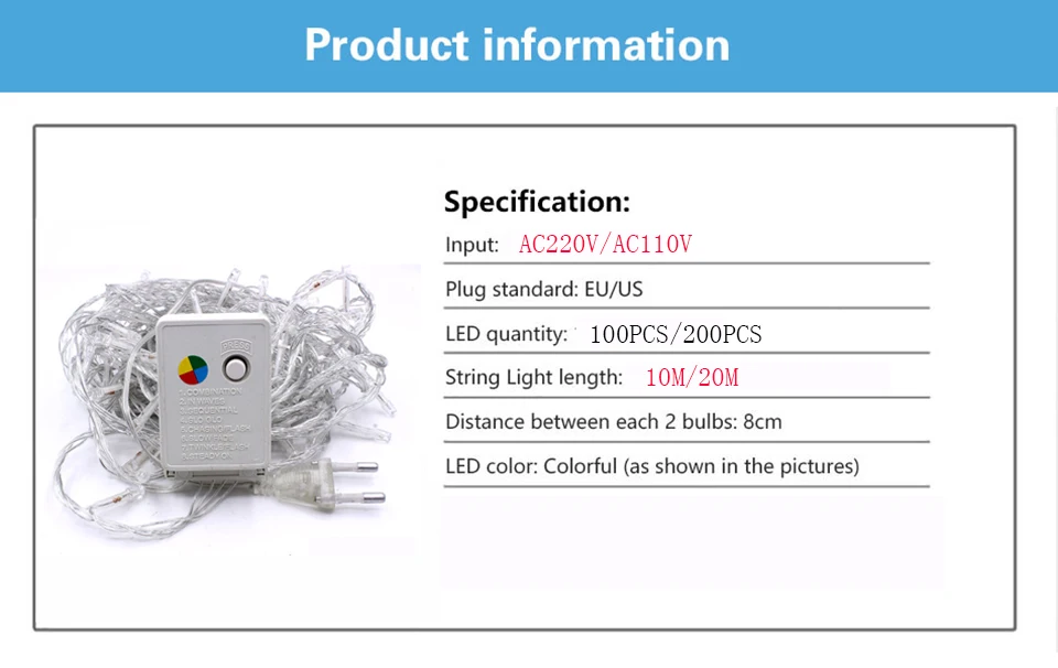 10 м 100 светодиодов Особенности: Мини и художественный внешний вид, легко носить с собой. Разноцветный светильник выглядит очень красиво ночью. Струнный светильник с 100 светодиодный лампочками. Низкое энергопотребление, безопасно и надежно. Конструкция с одной кнопкой, удобна в использовании. Океаны маленьких звезд мерцают, мигают и волшебно меняются. Его можно положить или повесить на стены, окна, двери, полы, потолки, травы, рождественские деревья и т. д. Идеальное украшение для Дня Святого Валентина, Рождества, других праздников, вечерние, свадебные и т. Д. С 8 различными режимами воспроизведения: комбинация, волны, последовательно Чеканка/вспышка, медленная/выцветает, мерцает/мигает, устойчива. Спецификация:(10 м 100 светодиодов) Светодиодный Цвет: красный/зеленый/синий/белый/теплый белый/RGB/розовый/фиолетовый Количество СВЕТОДИОДНЫЙ: 10 м/100 шт. Входное напряжение: 110 В/220 В Стандарт Вилки: США/ЕС (США использовали 110 В, ЕС использовал 220-240 В) Строка светильник Длина: около 10 м