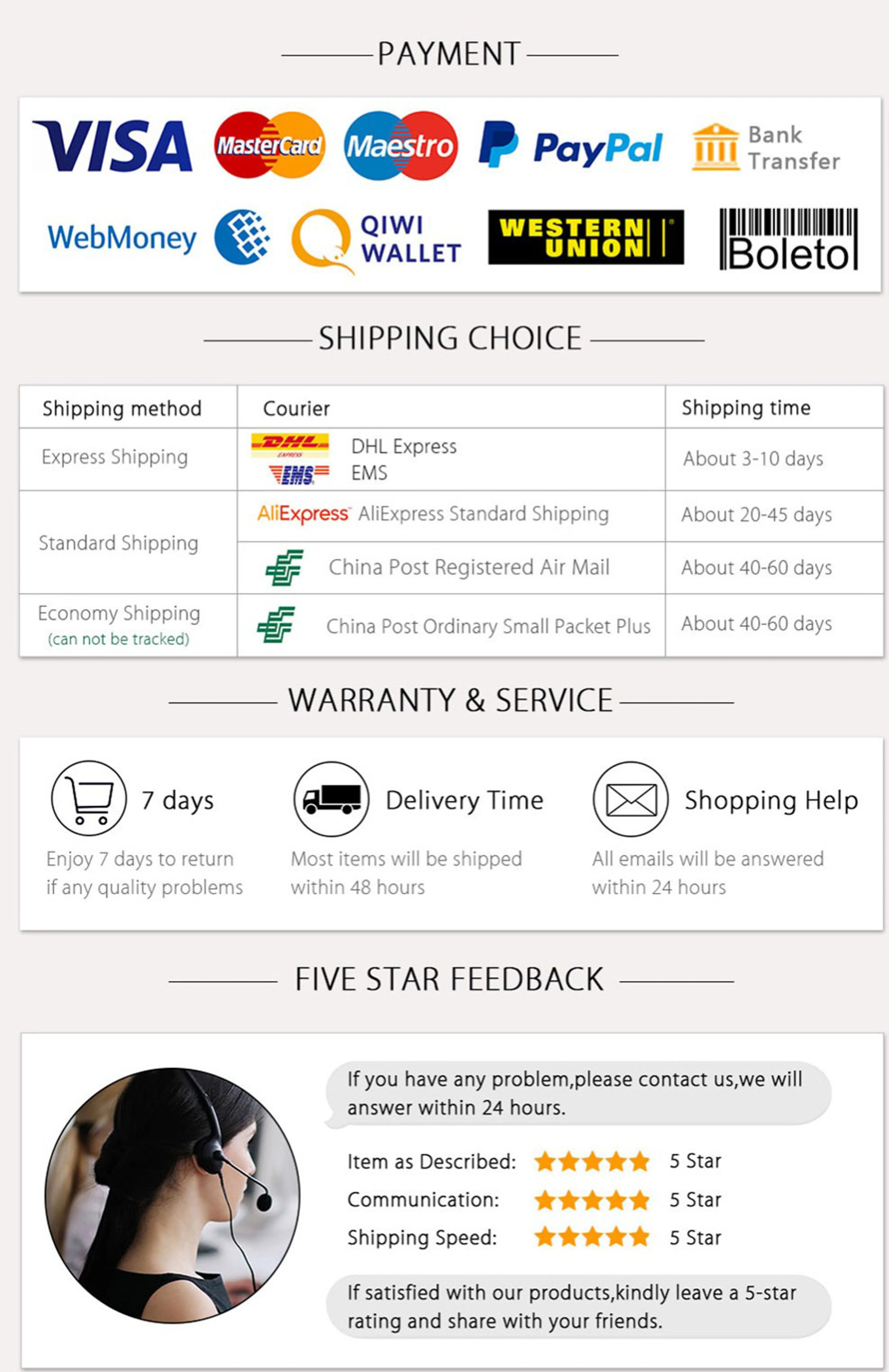 Доставка и обработка 1. ваш заказ, как правило, будет отправлен в течение 2-5 рабочих дней после того, как ваш платеж будет очищен (исключая наши выходные и праздничные дни). если он прошел наш новый год, пожалуйста, Продлите время доставки. 2. пожалуйста, подтвердите правильность вашего адреса и номера телефона. и сообщите нам ваше полное имя (некоторые почтовые отделения очень строгие с ним. И некоторые страны, такие как Россия, имеют регулирование). мы не несем ответственности за результаты из-за неправильного адреса. 3. для некоторых способов доставки, таких как DHL, иногда мы отправляем посылку, но мы должны ждать номер передачи. пожалуйста, не беспокойтесь об этом. мы просто ждем, пока номер передачи будет заполнен. 4. для AliExpress стандартной доставки, в общем, это быстро. но вы должны оставить свой правильный номер телефона или E-mail.If, что они не могут связаться с вами, это может повлиять на доставку. или вы можете беспокоиться о сообщениях, которые я отправлю вам на AliExpress. 5. Обычно посылка будет доставлена в ближайшее почтовое отделение. Вы несете ответственность за отправку в почтовое отделение для проверки. 6. как правило, мы объявим низкую стоимость, чтобы избежать или уменьшить таможенную пошлину. вы также можете связаться с нами, чтобы сообщить нам налоговое регулирование в вашей стране. но если таможенные пошлины произвольно взимаются за налог без причины, или они не верят, что цена слишком низкая. вы несете ответственность за помощь в таможенной очистке и налоге. 7. Некоторые страны имеют строгие таможенные правила, клиенты будут оплачивать все таможенные пошлины или любые другие сборы за обработку, особенно для клиентов в Канаде. 8. иногда у вас может быть задержка в получении посылки из-за праздников, таможни, эффективности местной отправки или других причин. для этой ситуации, пожалуйста, не стесняйтесь связаться с нами, чтобы продлить время вашей защиты. не открывайте спор по этой причине, потому что доставка полностью не контролируется продавцами, это должны быть почтовые службы. спасибо за понимание. 9. посылка будет в основном отправлена Авиапочта Китая (зарегистрированная почта) в течение 3 рабочих дней. обычно прибытие занимает 10-25 рабочих дней, но в некоторых странах это может быть немного дольше из-за праздников или таможни, эффективности местной отправки или других причин, поэтому, пожалуйста, обдумывайте перед выбором, Если вы не хотите ждать так долго, пожалуйста, оплатите Экспресс-плату или, пожалуйста, не покупайте. Как правило другим службам требуется всего 3–7 дней. Свяжитесь с нами, если вы хотите организовать доставку с помощью служб DHL, UPS, EMS, FedEx или других курьерских компаний. Авиа-отправление Почты Китая: Доставка в Российскую Федерацию обычно занимает 30–45 рабочих дней В США, Канада обычно занимает 10-18 рабочих дней Доставка в Австралию, Новую Зеландию, Сингапур обычно занимает 12–20 рабочих дней Доставка в Великобританию, Францию, Испанию, Германию, Голландию, Японию, Бельгию, Данию, Польшу, Финляндию, Ирландию, Норвегию, Португалию, Швейцарию и Швецию обычно занимает 12–25 рабочих дней. В Италию, Бразилию обычно занимает 20-30 рабочих дней В других странах обычно требуется 15-25 рабочих дней. EMS доставка обычно занимает 4-7 рабочих дней. Стоимость доставки не включает импортные налоги. Таможенные пошлины оплачиваются 