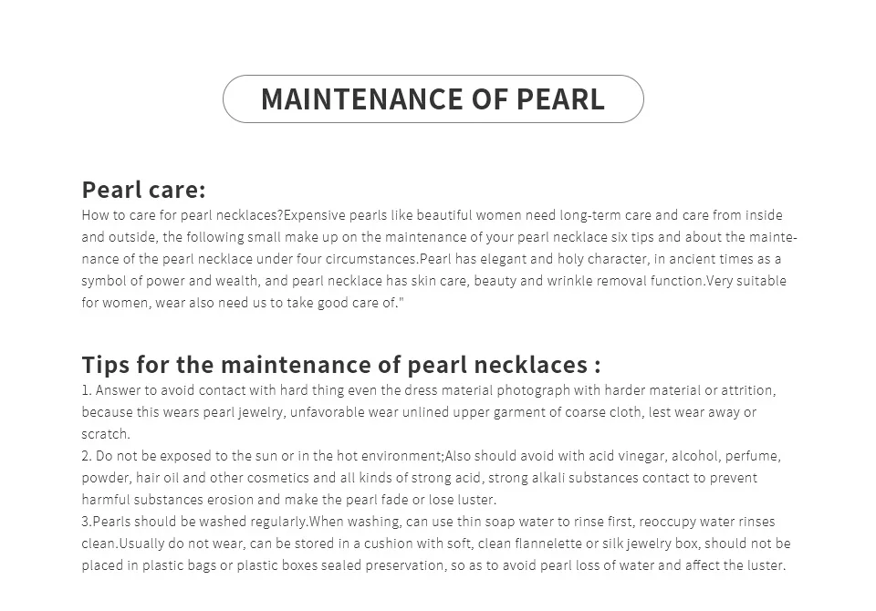 1. Избегайте контакта или трения с твердыми материалами или даже твердыми материалами. Поэтому носить жемчужные украшения не следует с грубой тканью, чтобы избежать истирания или царапин. 2. Не подходит для использования под воздействием солнечных лучей или при нагревании при высоких температурах; Следует также избегать контакта со кислым уксусом, спиртом, духами, порошком, масло для волос и другие косметические средства и различные сильные кислоты и сильные щелочные вещества; Жемчуг выцветает или теряет блеск. 3. Жемчужины следует регулярно чистить. При стирке краску разбавляют мыльной водой и краску водой. Когда это не нормально, его можно хранить в ювелирной коробке с мягкой, чистой флисовой или шелковой эмалью. Его не следует хранить в полиэтиленовом пакете или пластиковой коробке, чтобы не допустить потери воды жемчугом и воздействия на блеск.
