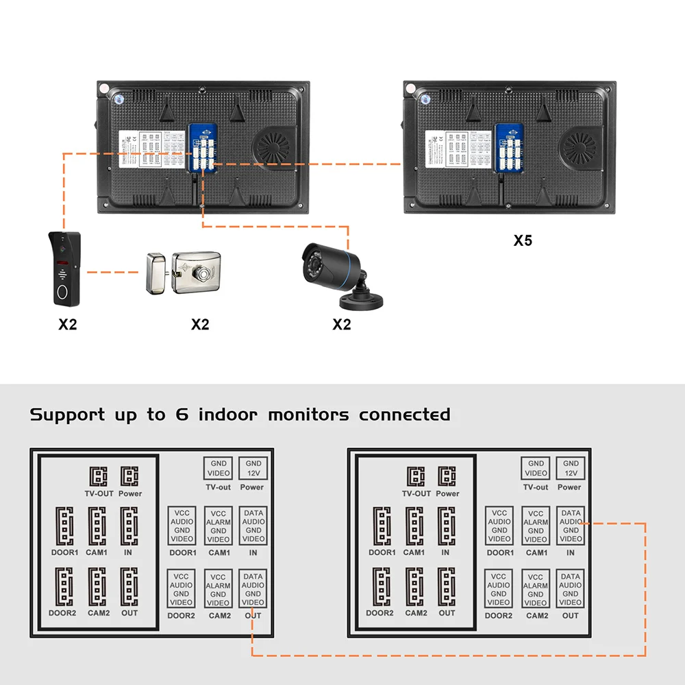 Система поддерживает до 6 мониторов, 2 Дверных звонка, 2 камеры видеонаблюдения и 2 датчика сигнализации