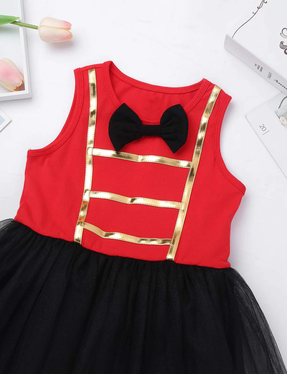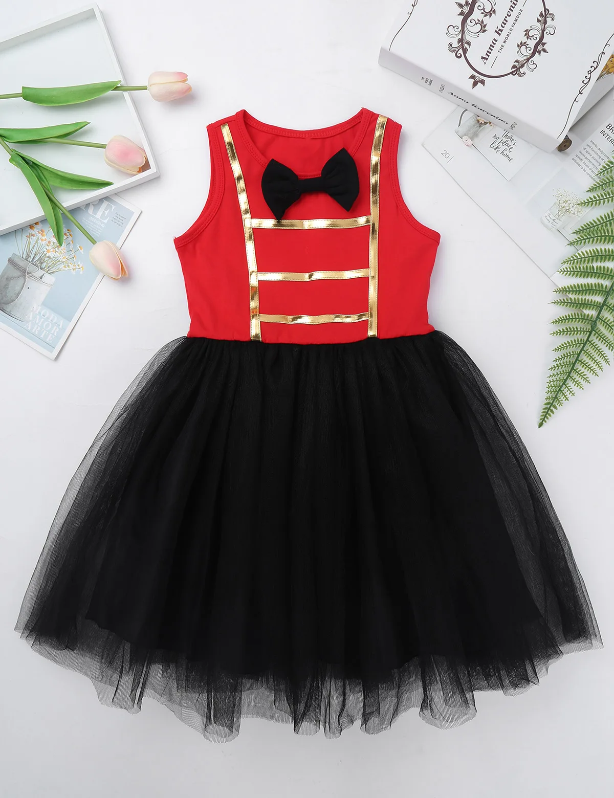 Sleeveless, round neckline with a bowtie at front. Cotton top bodice is decorated with gold trimmings.