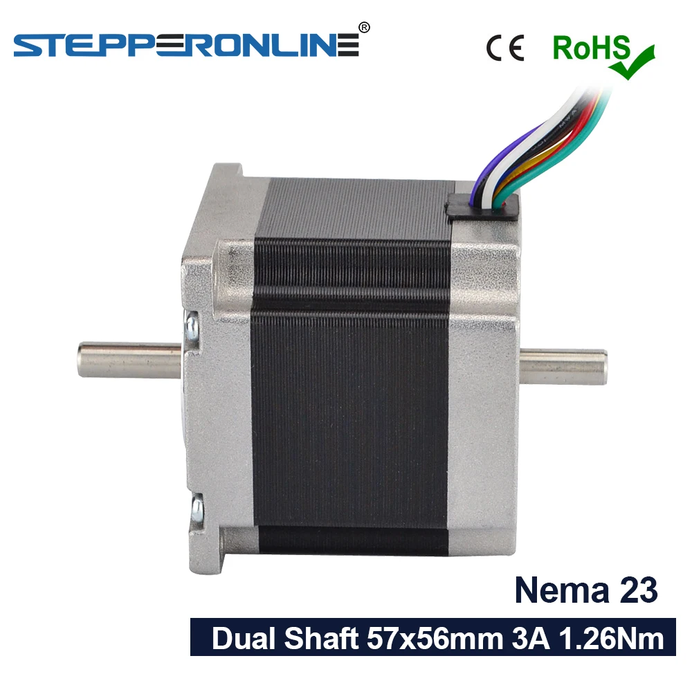 Этот мотор Nema 23 шаговый двигатель с шагом угол 1.8deg и размер 57x57x56mm. Он имеет 8 проводов, которые имеют три варианта подключения: однополярный или биполярный (последовательный) или биполярный (параллельно), вы можете выбрать любой тип, как вы хотите. Это хоулдинг крутящего момента достижения 0.9Nm (127,5 oz. Нажмите на изображение для просмотра в полный размер дюйма) с однополярный соединения и 1.26Nm (178,4 oz. Нажмите на изображение для просмотра в полный размер дюйма) с биполярного соединения. Задний вал может прикреплять энкодер, маховик или равен.