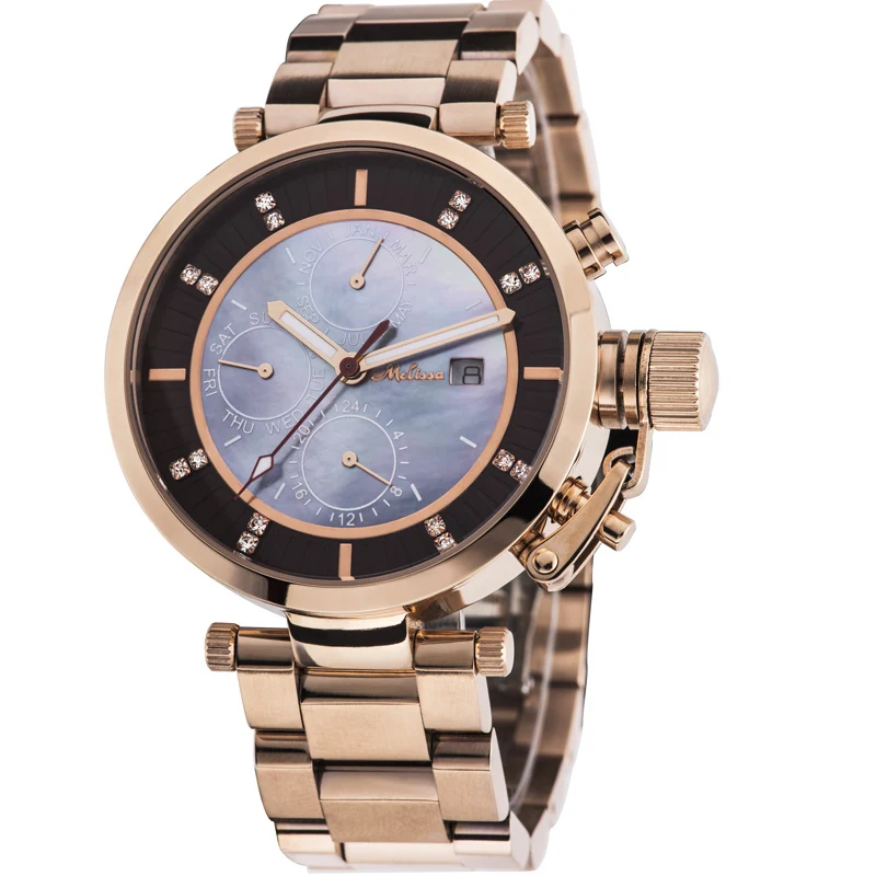 Часы изготовлены с японским механизмом Miyota кварц и сапфировые пластины, кристаллами Swarovski (Высшее качество на AliExpress) Pacel включает: часы + коробка MELISSA + подарок бесплатно 3 года гарантии Все фотографии этого товара являются реальными. Не Photoshop.