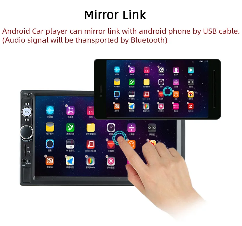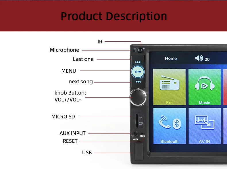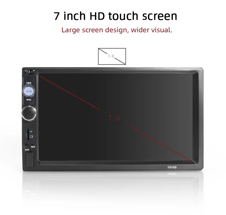 1. Размер сенсорного экрана: 7 дюймов 2. Напряжение: 12 В постоянного тока 3. Сопротивление динамика: 4 Ом 4. Максимальная мощность: 50 Вт * 4 5. Регулятор громкости: +/-8 дБ (бас 100 Гц ВЧ 10 кГц) 6. Диапазон настройки FM: Диапазон настройки: 87,5-108 МГц Применимо Чувствительность: 15dB Отношение сигнал/шум: 50dB Стерео Разрешение: 30dB 7. Помощь системы парковки автомобиля. Он превратится в режим парковки автоматически, запись трафика. (заднего вида камера не входит в комплект) 8. Функция Bluetooth: Встроенный Bluetooth для беспроводной потоковой передачи звука, встроенный микрофон для громкой связи. Решить вашу проблему вызова, когда вы едете. Более того? Подключите телефон с функцией bluetooth, поднимите звук вашего gps и ваших любимых песен в автомобильном динамике. 9. Многофункциональный: 5 В с высоким током USB выход, можно заряжать мобильный телефон Играйте роль вашего MP3, MP5 плеер, радио, датчик парковки и т. д. это ваш лучший выбор для вашего автомобиля. 10. Язык: русский/английский/китайский/итальянский/немецкий/испанский/французский/португальский