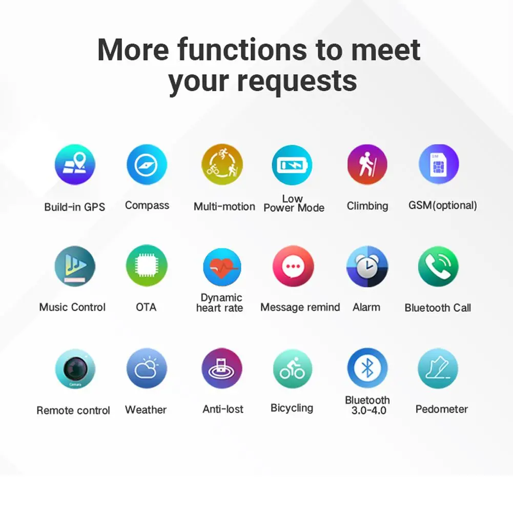 Функции: компас, датчик давления, атмосферное давление, высота, геомагнитный, громкоговоритель, время/дата, сжигание калорий, автоматическая запись активности (ходьба, пульт ДУ, бег), встроенный gps-трек (бег в помещении, бег на открытом воздухе, Велоспорт, альпинизм, марафон), тренировка дыхания, Автоматический монитор сна, Сообщение Push/напоминание о сообщениях в социальных сетях, будильник, энергосбережение, управление Фото, воспроизведение музыки Bluetooth/микрофон/динамик/Синхронизация с мобильным телефоном