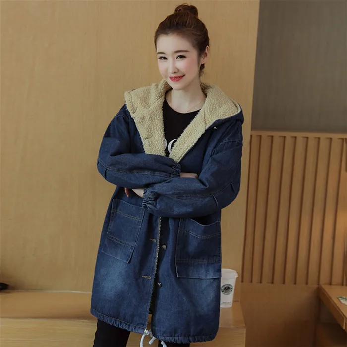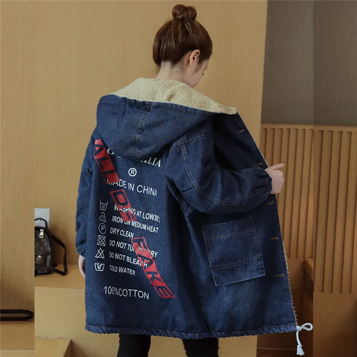 Женская джинсовая куртка с капюшоном JIA418, Свободное пальто средней длины большого размера из плотного бархата, зима 2019