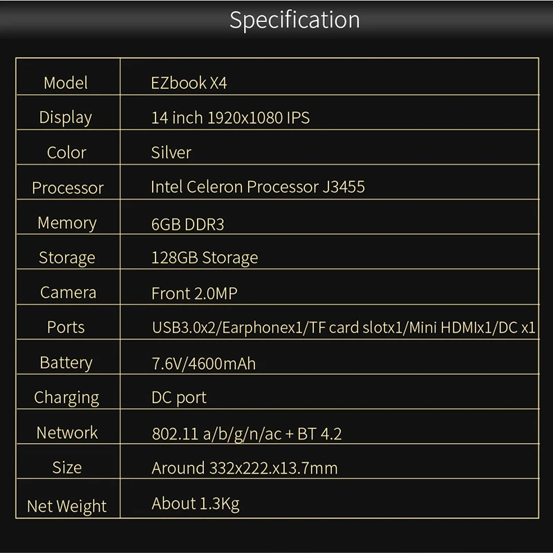 EZbook X4 оснащён процессором I-ntel Celeron J3455, четырехъядерным процессором quad thread. Производительность по сравнению с предыдущим поколение платформы apollo lake была улучшена, и многозадачный срок обработки короче.