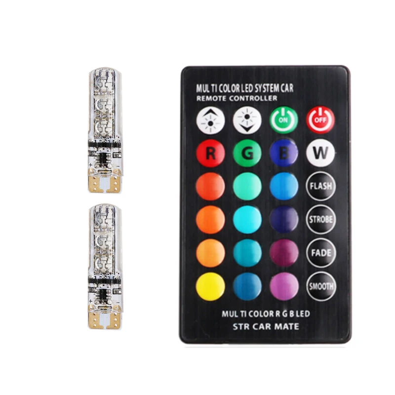 Product parametersBrand: Haoyuehao Model: T10Light bulb and accessories type: Colorful remote control Car bulb type: universal width lampHeadlight model: LED Color classification: [remote control enhanced models can switch monochrome / colorful 2 price]Specification:Item: LED BulbVoltage: DC 12VSocket: T10 / 192 / W5WLight Source: 5050 SMD LEDEmitting Color: RGB (Control by the Remote Controller)Power of Remote Controller: Button Battery (Included)Waterproof: IP6516 color Strobe flash, Faster on / off response time360 degree beam angle design can illuminate every corner.High efficiency lighting. Note:One controller can not control two lamps at the same time, so you need to aim to lamp one by one ,and the effective range is less than 5 meters. Package Content:2 x RGB T10 LED Bulb1 x Remote Controller