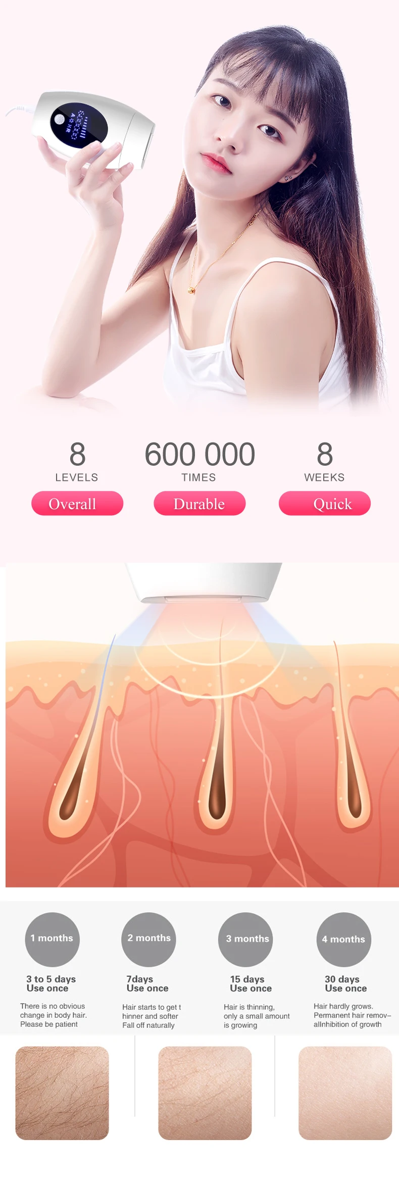 Напряжение: AC100-240v В переменного тока, 50/60 Гц Мощность: 36 Вт ЖК-дисплей Дисплей: Да Светильник интенсивность: 8 уровней (может быть отрегулировано) Лампа: кварцевая лампа Устройство распознавания кожи: Да Рабочая модель: Автоматическая/ручная Подходит для: подмышек, ног, зоны бикини, лица, ног, подбородка, груди, спины Подходит для: женщин/мужчин Импульса: 600000 шт Языки руководства пользователя: английский Языки розничной коробки: английский Цвет: белый/розовый Длина волны: 580-1200 нм После выключения вентилятор будет продолжать вращаться в течение 30 секунд, чтобы полностью рассеивать тепло для платы машины