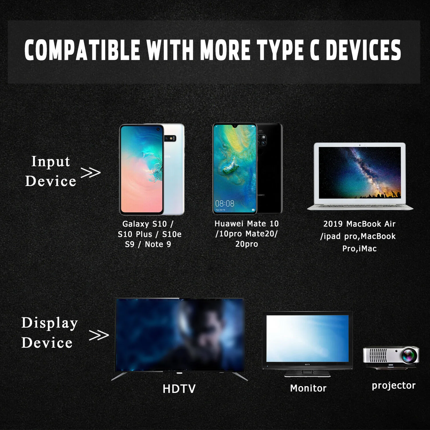 * Кабель совместим с Samsung Galaxy S8, 8 + plus huawei mate10 P20 (pro) и MacBook с подключением типа C.