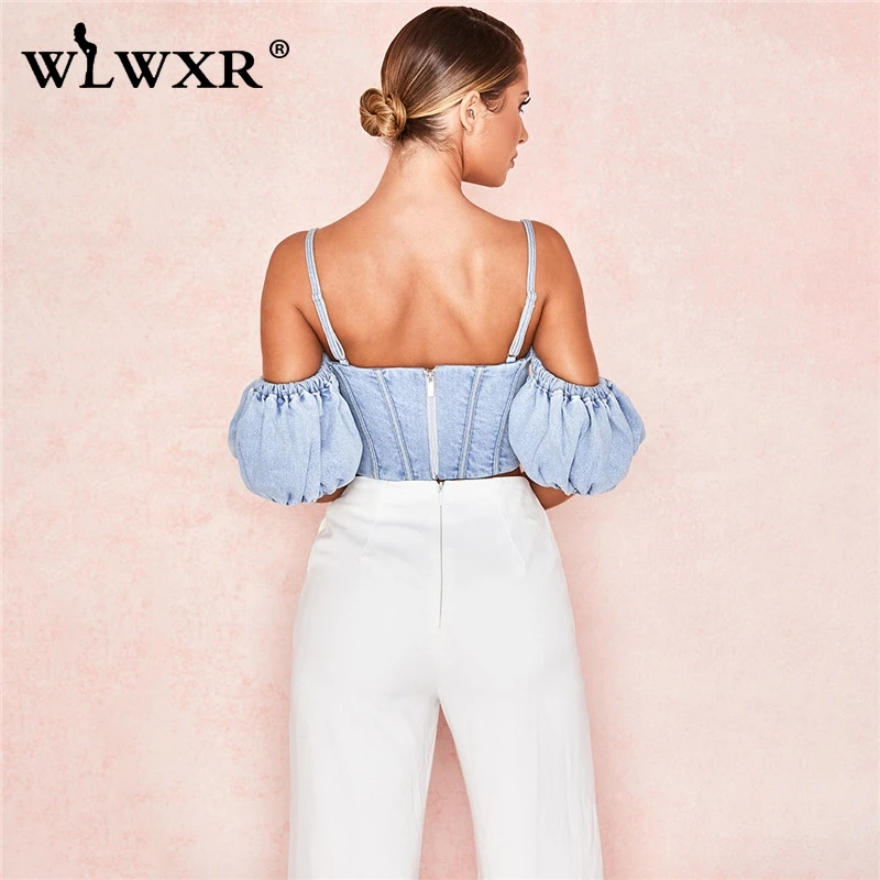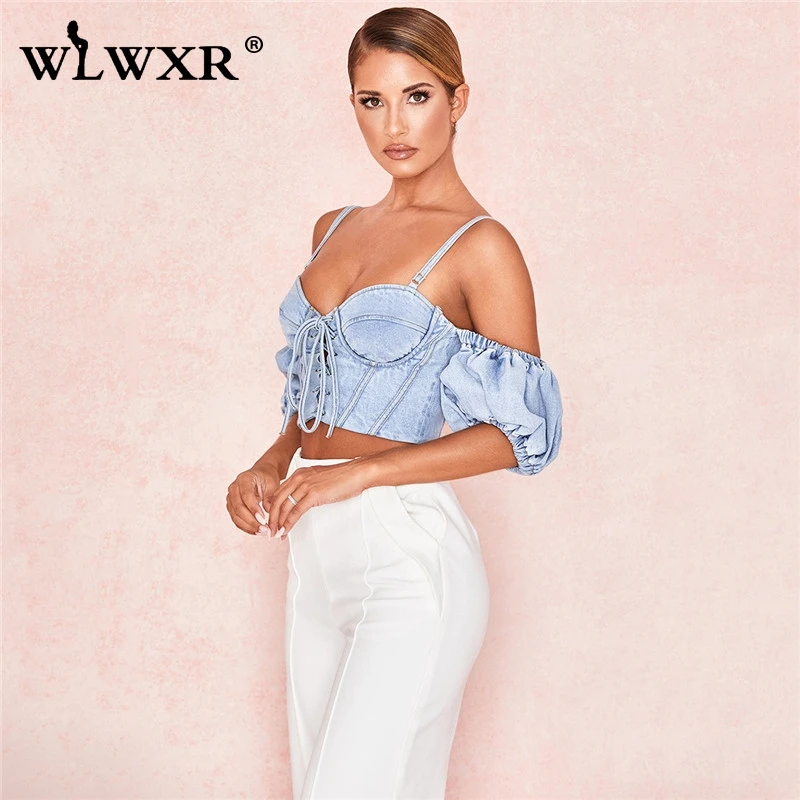 WLWXR на шнуровке, джинсовый сексуальный облегающий укороченный Топ для женщин, майка бюстье, джинсы, Дамский топ на бретелях, женский укороченный бандажный топ с открытой спиной, летние топы