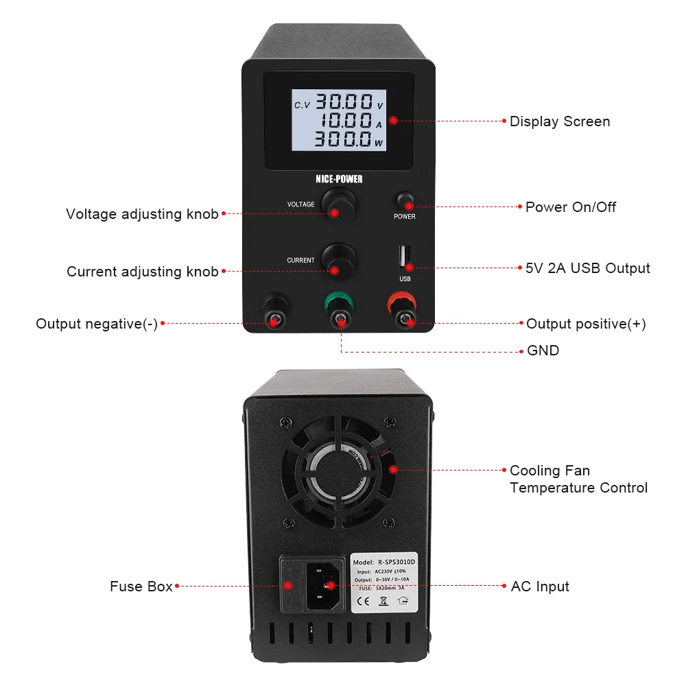 1. Имеет полную функцию операционной защиты 2. Высокая эффективность, низкая пульсация, малый объем, светильник 3. Двойной дисплей напряжения, тока и высокой точности 4. Стабилизация напряжения, ограничение тока, простая работа 5. Двойной вход напряжения и удобный выбор 6. Тепловыделение вентилятора контроля температуры, низкий уровень шума 7. Двойной потенциометр более точная регулировка