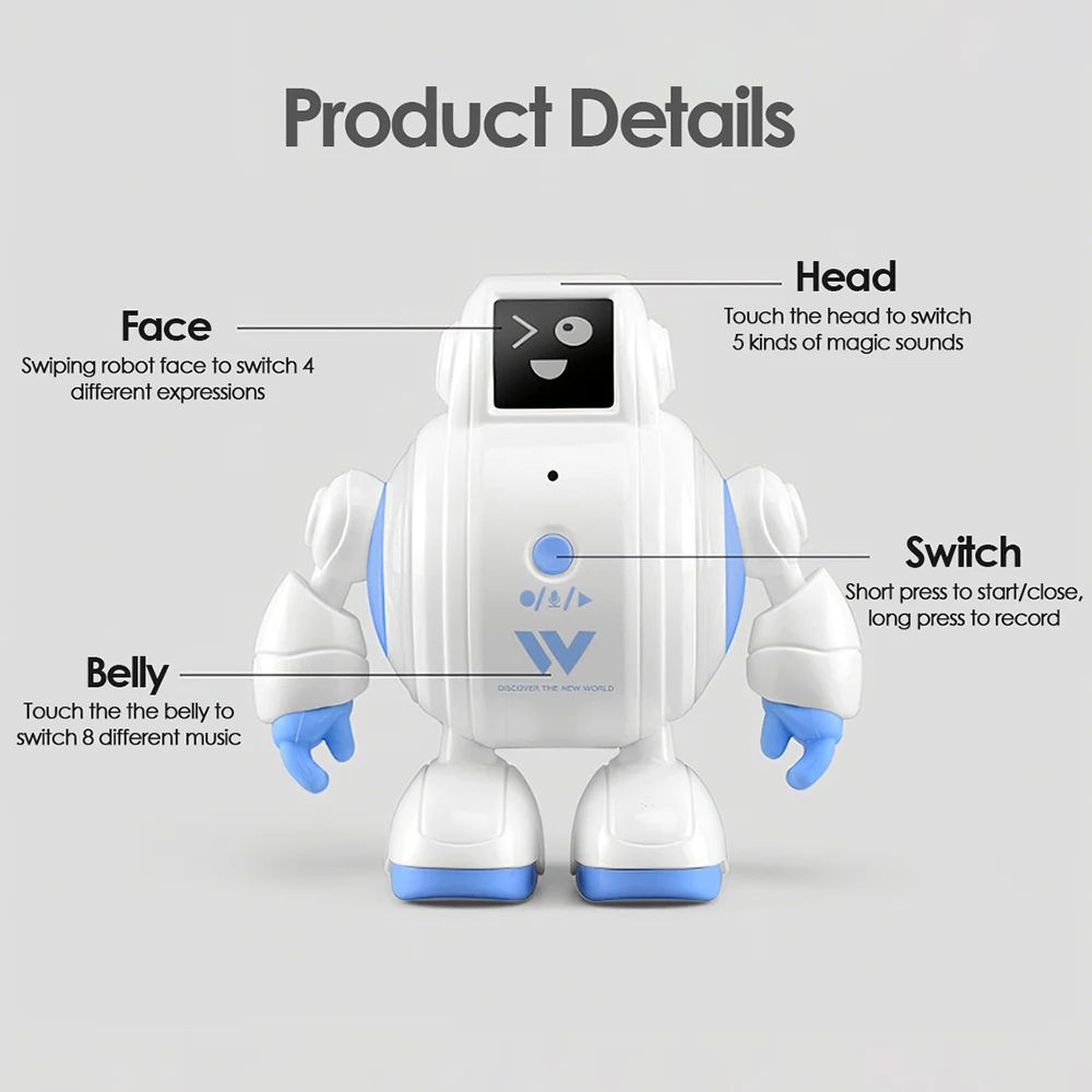 Этот робот для детей с 5 волшебными звуками и 8 звуками MIDI-это приятная игрушка. Дети могут играть в игры, принимать и танцевать с роботом. Скручивая лицо рокорт руками, существует 4 выражения лица со светодиодной подсветкой. Если вы беспокоитесь, что оставите детей дома в покое или не время для сопровождения детей, робот-лучший выбор для ваших детей. Сделайте его одним из ваших семей и наслаждайтесь развлечением в семье с вашим ребенком!
