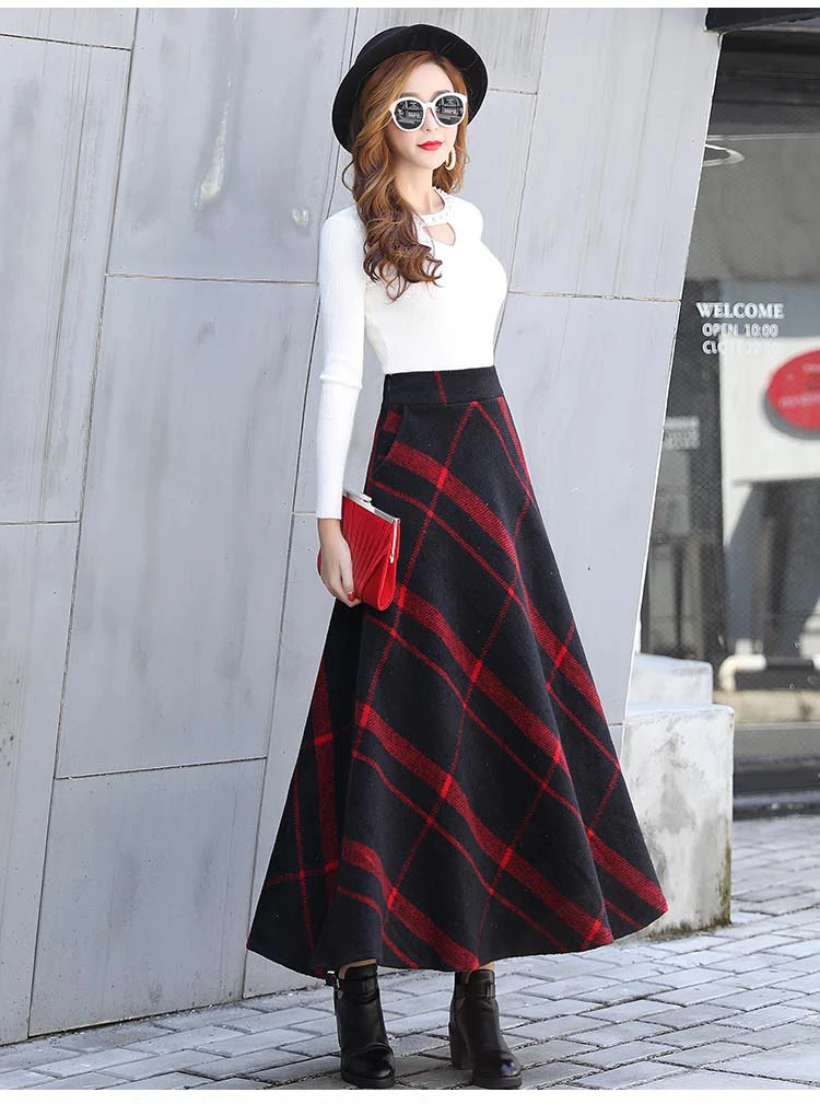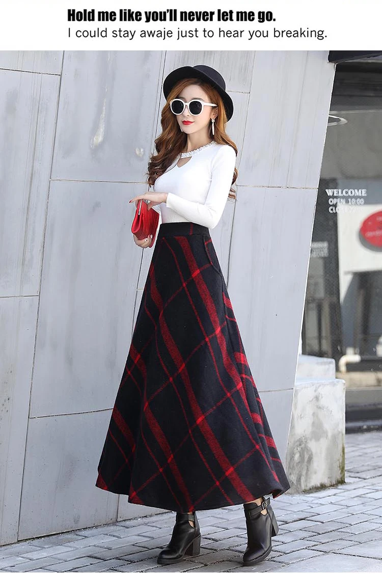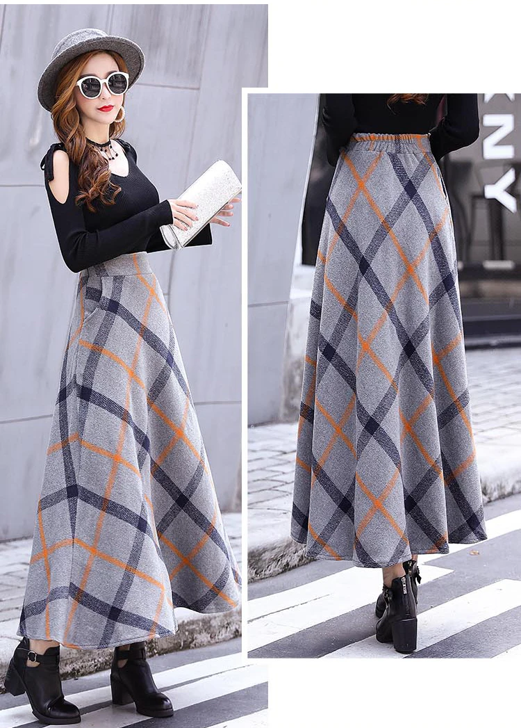 Зимние женские юбки трапециевидной формы, хит продаж, теплая дизайнерская Элегантная Женская Офисная длинная юбка с принтом в клетку, эластичные юбки с высокой талией, длинные юбки A427