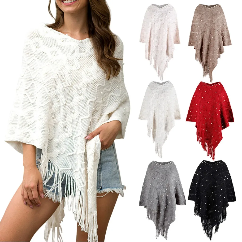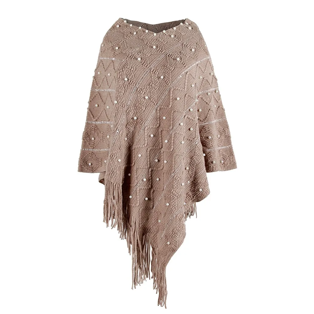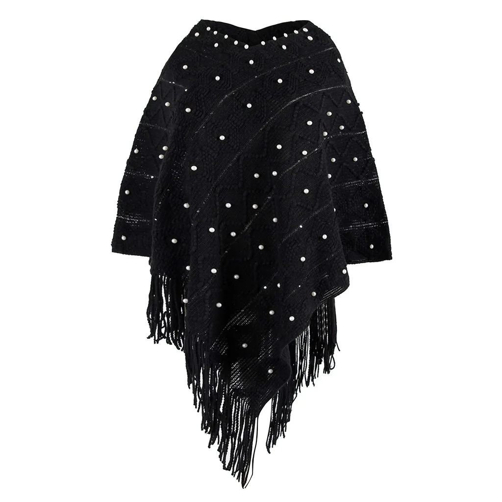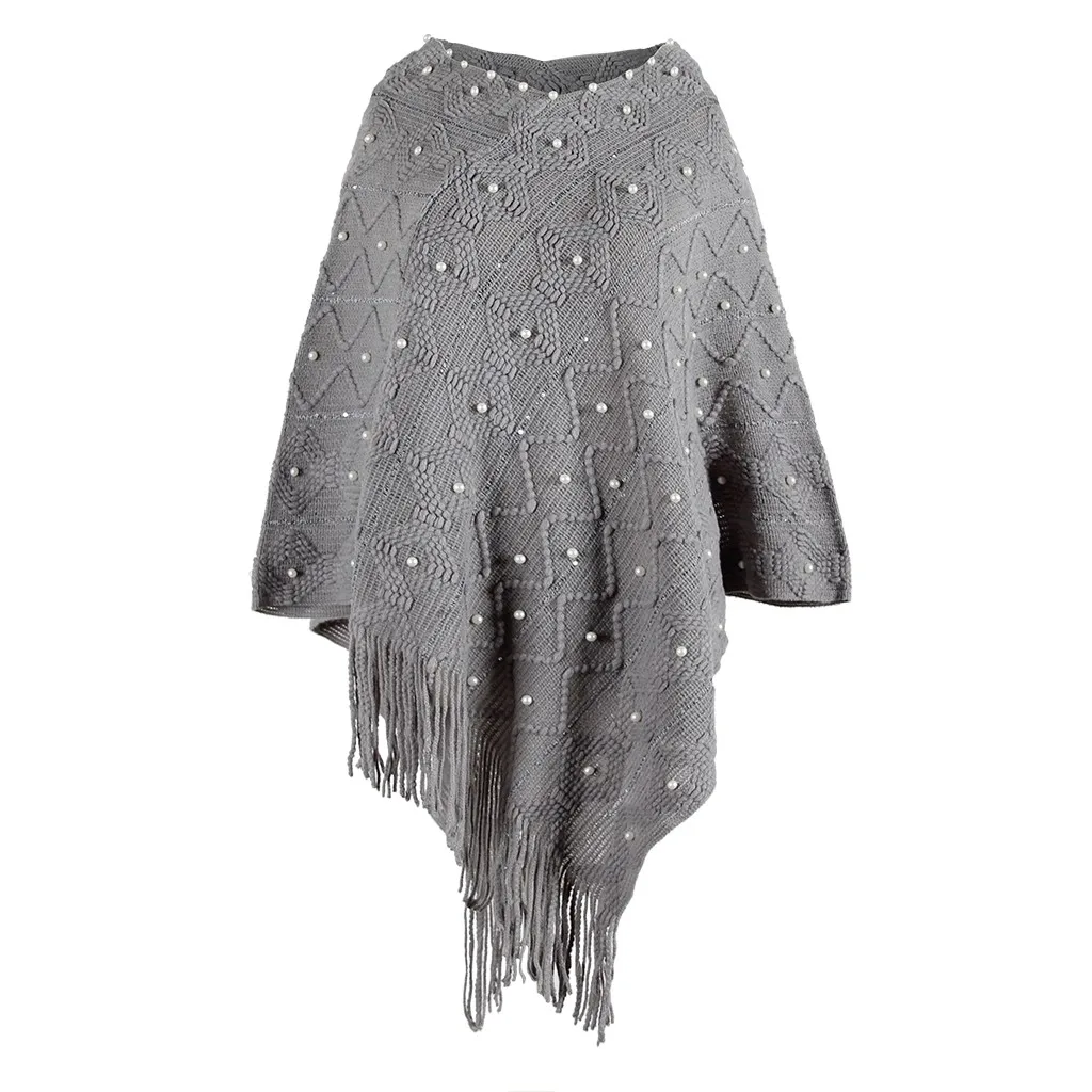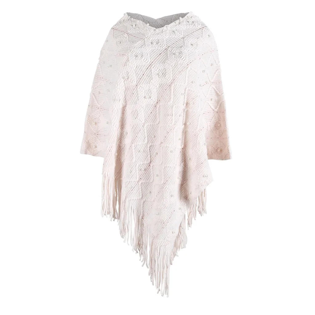 Зимняя накидка с капюшоном, Для женщин; Однотонная вязанная Накидки шаль из кашемира с бахромой "жемчужное" пальто пончо Mujer Invierno Elegantes накидка пончо Для женщин