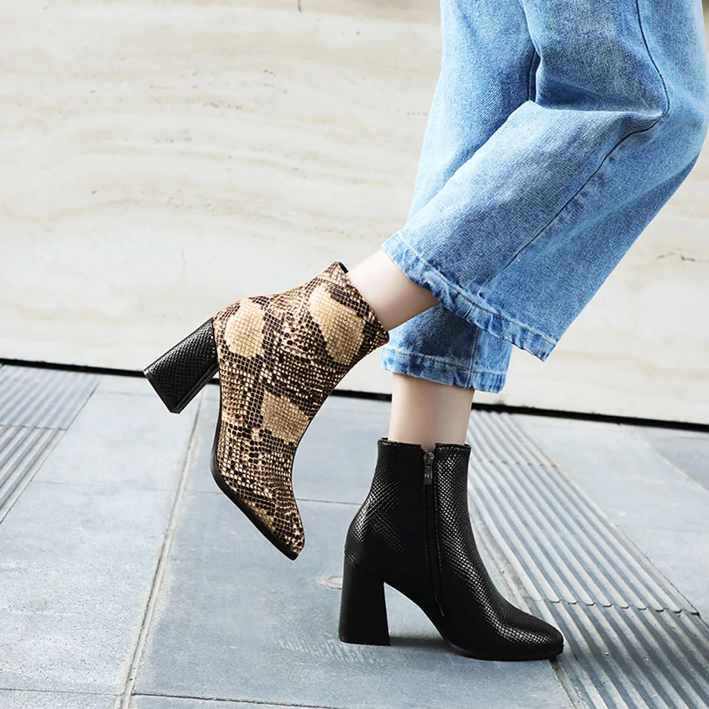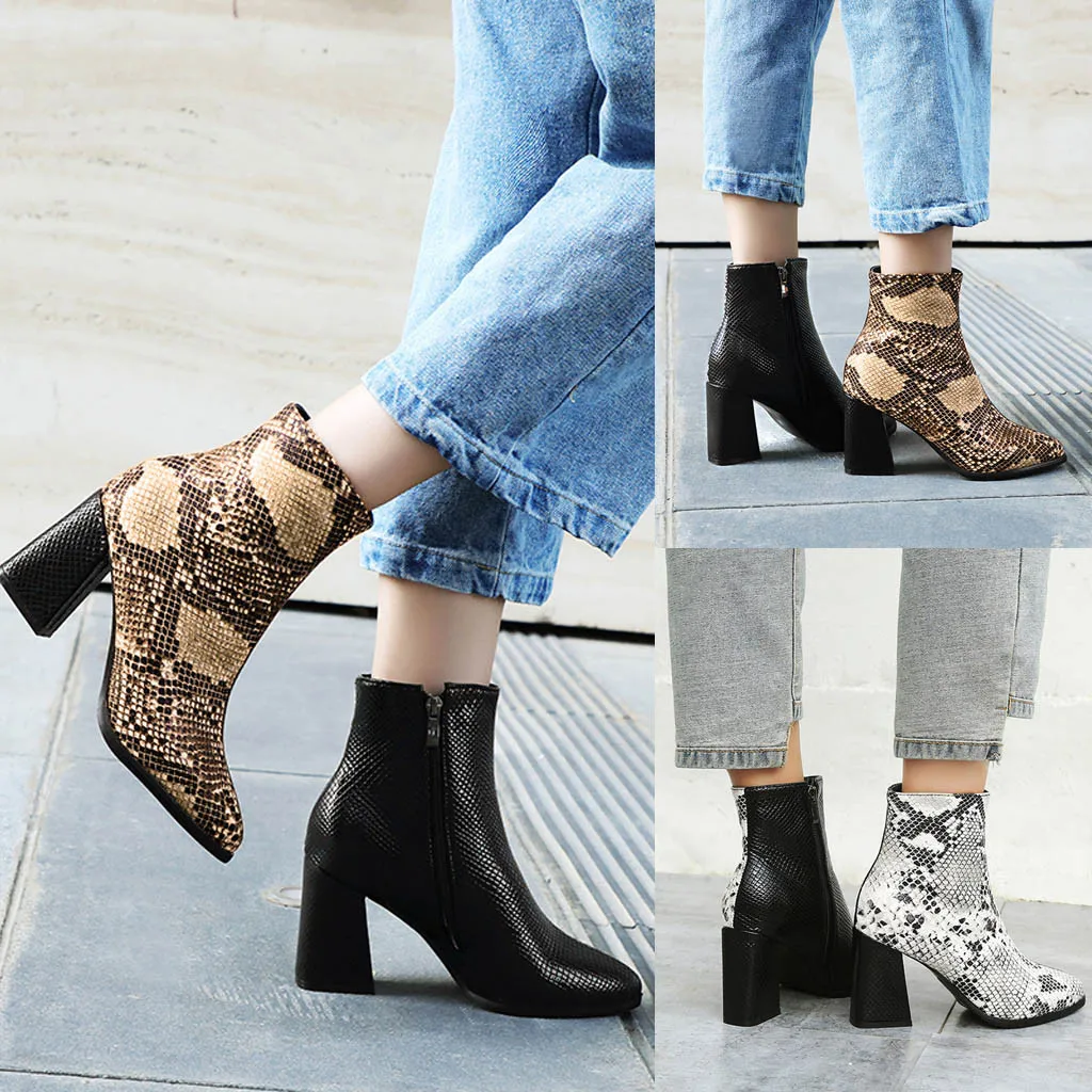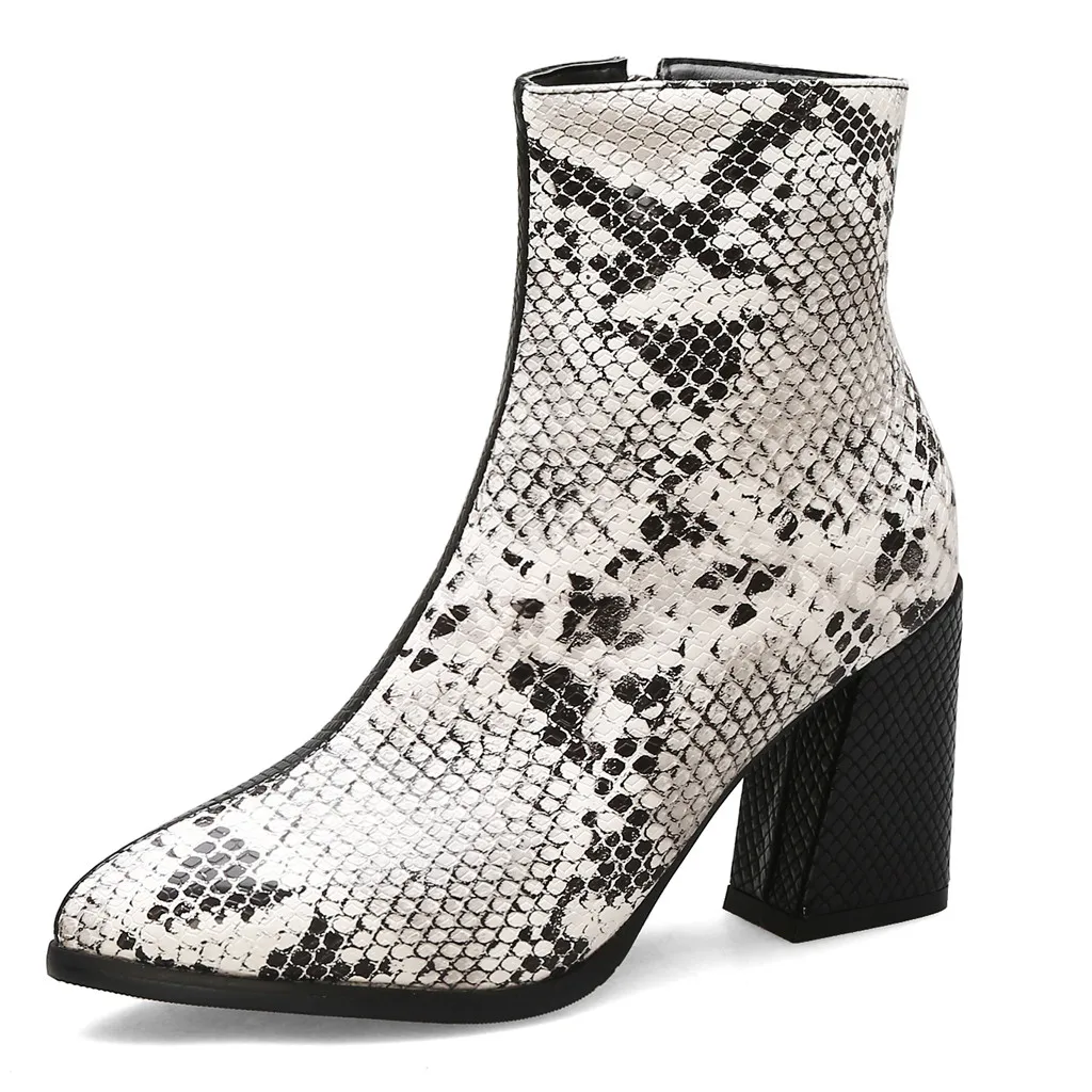 Женская обувь с острым носком на высоком каблуке; модная обувь с узором «змеиная кожа»; ботильоны большого размера