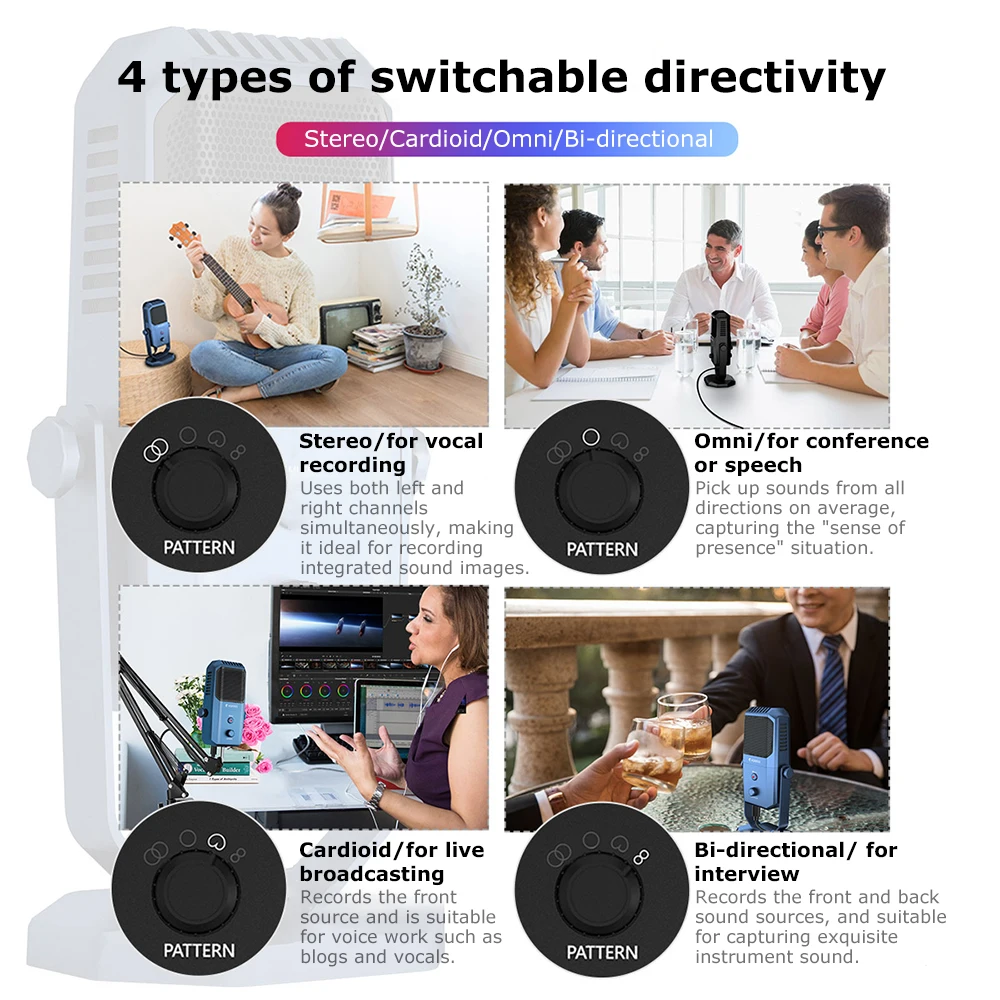 4 типа переключаемой направленности: стерео/кардиоидный/всенаправленный/Двунаправленный.
