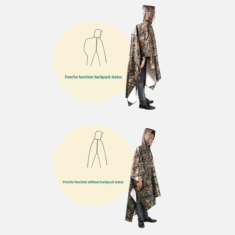 Прочный Изготовлен из высококачественного полиэфирного тафты, хорошего водонепроницаемого эффекта и очень прочного. Производительность лучше, чем традиционная пластиковая пленка плащ, продукты износостойкие, легкая чистка. Давление воды до 3000 мм/4000 мм. Многофункциональный дизайн Его можно использовать как плащ, коврик, тент, уменьшает нагрузку на путешествия. Портативный Портативный дизайн, можно сложить в карманы, легко носить с собой. Специальный дизайн пончо на спине Он предназначен для размещения больших выступов, также может быть сложен под дождем внутри, с манжетами на руку с помощью удобной конструкции головы с регулируемой полями. Максимальная посылка поддерживается до 80 л. Область применения Подходит для кемпинга на открытом воздухе, пеших прогулок, альпинизма и т. д. Горловина с волшебной палочкой, более удобная одежда.