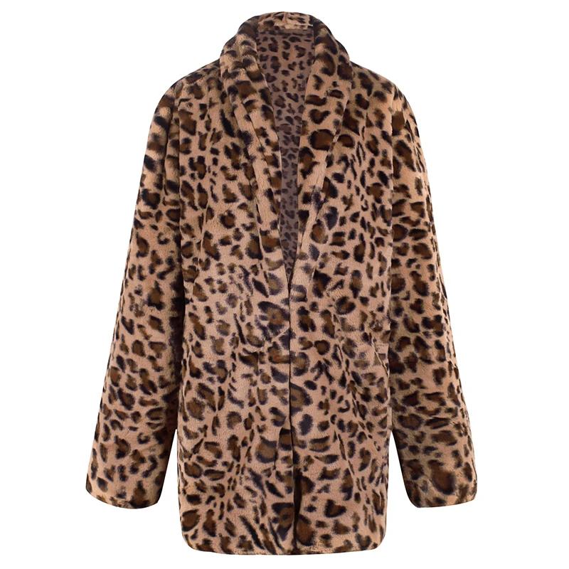 Эта куртка изготовлена из мягкой ткани с искусственным мехом, облегающей по фигуре, с ярким леопардовым принтом и элегантным воротником-шалью. Имитация модного стиля с полушарфом и свободными штанами.