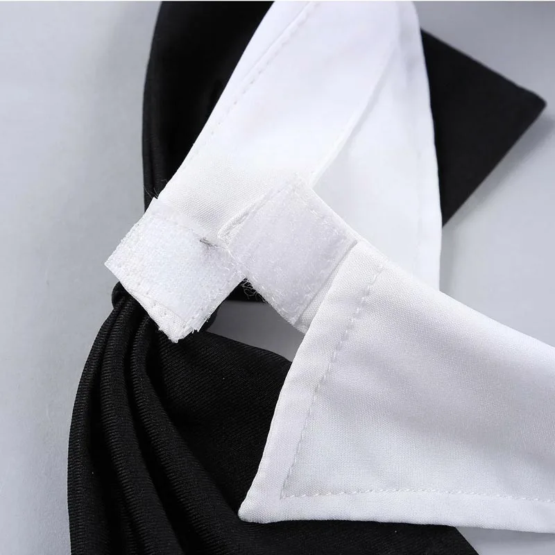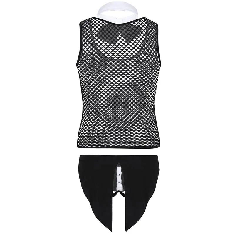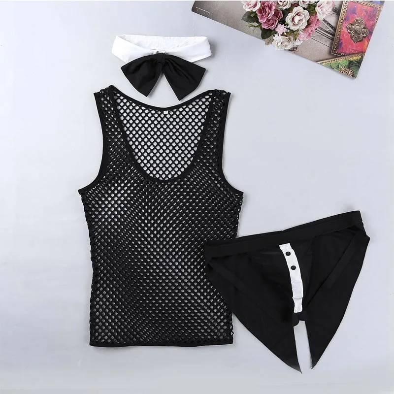 В комплект входит: 1 Мужская майка, 1 стринги, 1 воротник Материал: полиэстер + спандекс Новинка, смокинг для официанта, мужской костюм, включает в себя жилет, стринги и шею. Топ без рукавов, жилет с прозрачной сеткой, глубоким u-образным вырезом. Воротник на шее с черным милым бантом, застежкой на липучке. Нижнее белье с низкой посадкой и эластичным поясом и мешочком спереди, открытый дизайн с 2 треугольными тканевыми накладками сзади.