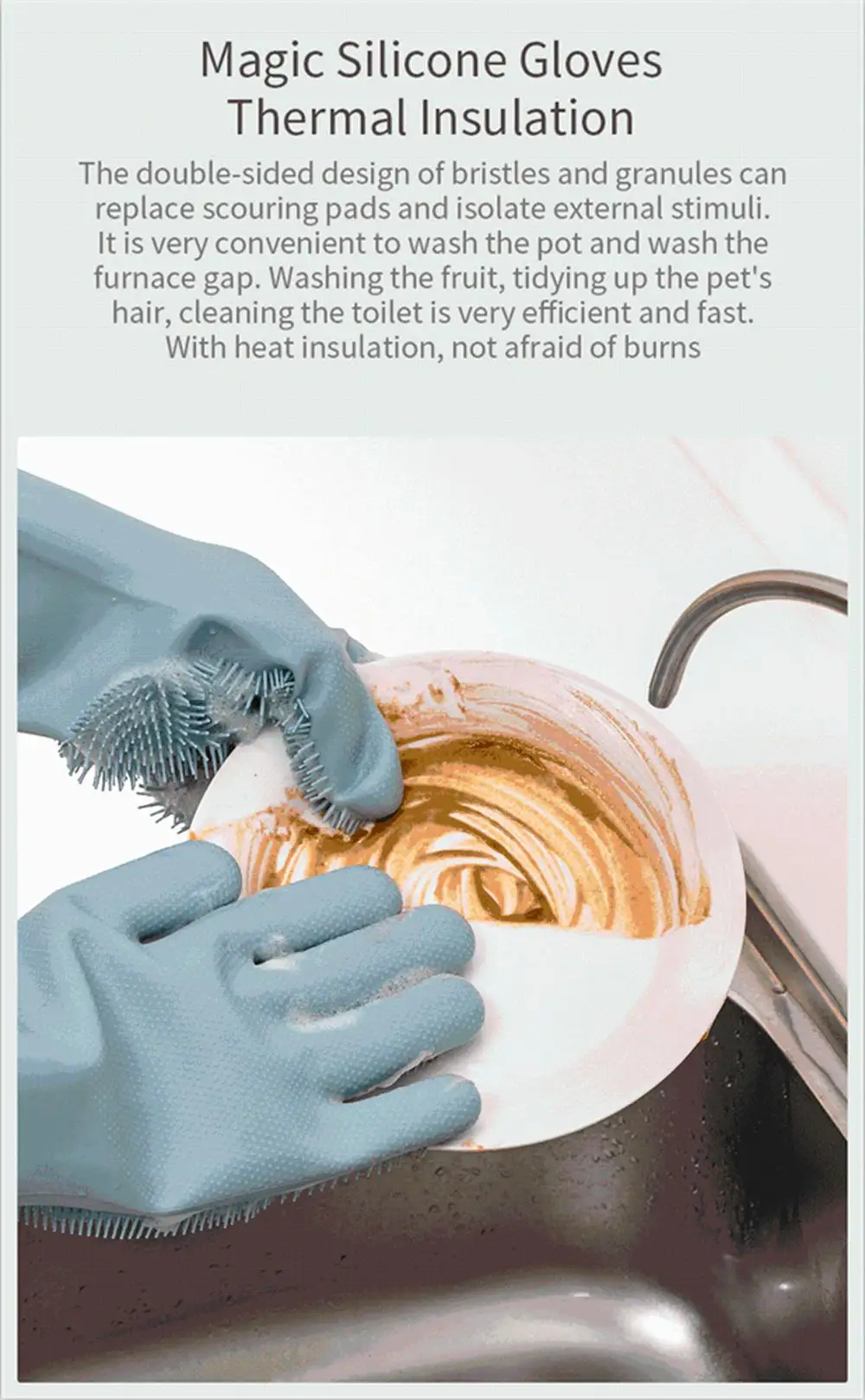Волшебные Силиконовые перчатки-теплоизоляция: Двухсторонняя конструкция щетинок и гранул может заменить губки и изолировать внешние раздражители. Очень удобно мыть кастрюлю и мыть интервал печи. Мытье фруктов, подтягивание волос питомца, очень эффективная и быстрая очистка туалета. С теплоизоляцией, не боится ожогов Обе стороны можно носить: Как щетинки, так и гранулы предназначены для обеих сторон. Есть для ношения двумя способами. Область применения очень широкая. Щетинки с одной стороны могут заменить чистящие средства, такие как тряпки и стальные шарики, чтобы сильно очистить масло. Другая сторона может использоваться в качестве обычных перчаток или изолированных перчаток. Нет необходимости в тряпках, чистка более удобна: Высококачественные плотные щетинки 8 мм, не нужно протирать ткань при чистке, только небольшое количество моющего средства, можно быстро вспенить обеими руками, легко удалять пятна Анти-обжигание и термостойкость: Перчатки изготовлены из экологически чистого силикона. Устойчив к высокой температуре-20-200 °C. Он не токсичен и не имеет запаха. Толщина умеренная. Его можно взять из микроволновой печи и парохода. Он не боится ожогов. Также можно варить при высокой температуре, дезинфекции Стирайте его с помощью смыва: Полностью использовать гидрофобность и анти-окрашивание свойств силиконовых материалов. При чистке перчаток вам нужно только натереть руки ладонями. Гибкий и износостойкий: Силиконовый материал очень мягкий и эластичный, не легко деформируется, износостойкий, длительный срок службы Двойная защита от скольжения внутри и снаружи: Назначение указательного пальца очень гибкое. Внутренний слой перчаток имеет плотные противоскользящие мелкие частицы, которые соединяют частицы внешнего слоя для увеличения трения. Его можно избежать при использовании. Удлинение дизайн: Продольное направление перчатки имеет расширенный дизайн. При чистке в воду нелегко войти, чтобы рукава не промокали, и не нужно беспокоиться о том, что зимой замерзнут руки. Когда вы берете вещи с парохода, вы можете эффективно защитить руки от паровых ожогов. Маленькая круглая конструкция отверстия: Круглый дизайн отверстия, можно повесить в любое время, в любом месте, быстро сливается, не легко размножать бактерии, экономя пространство для хранения