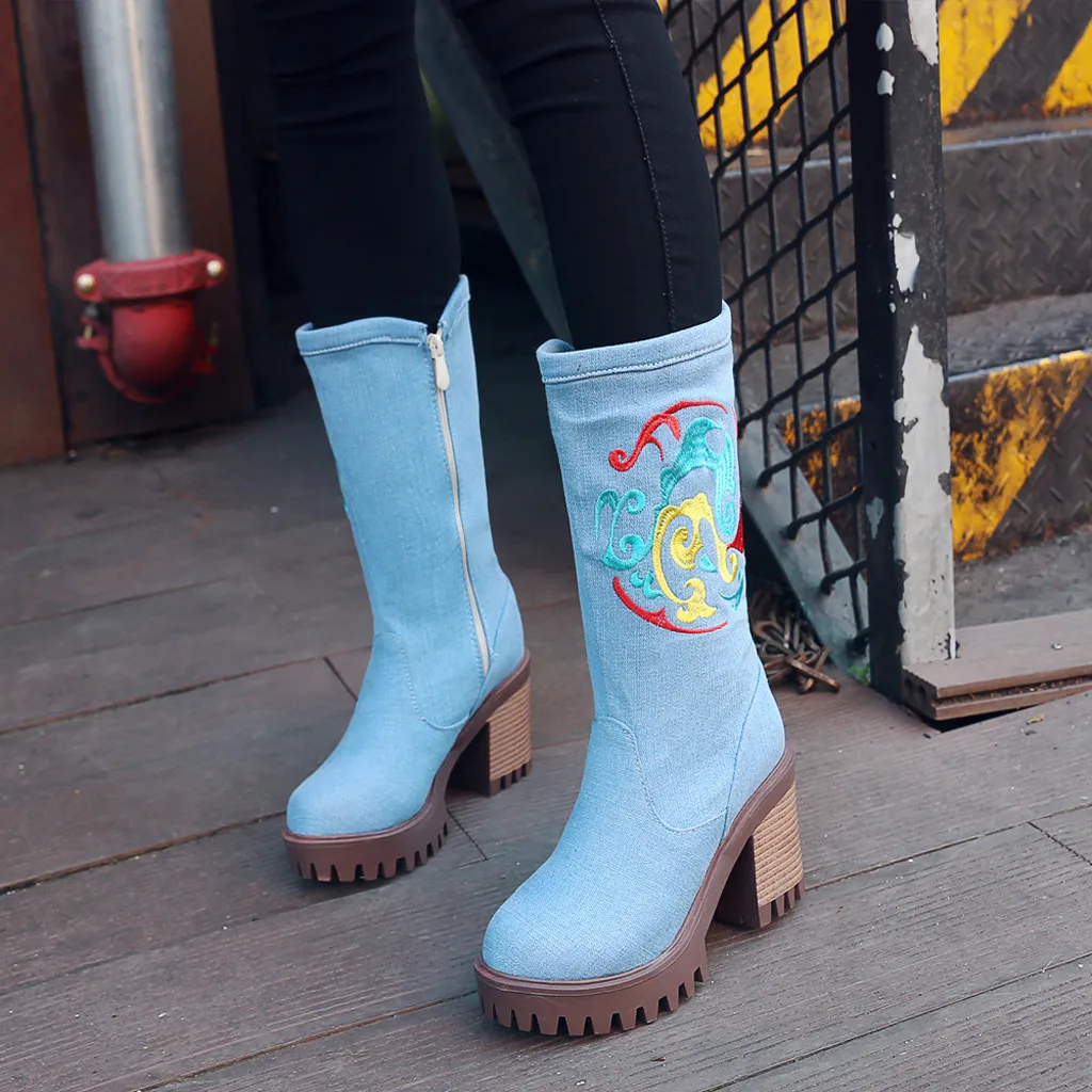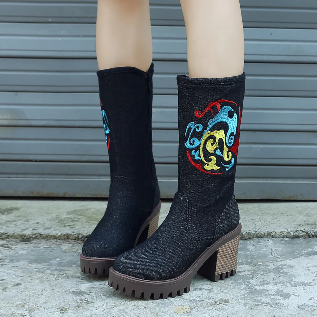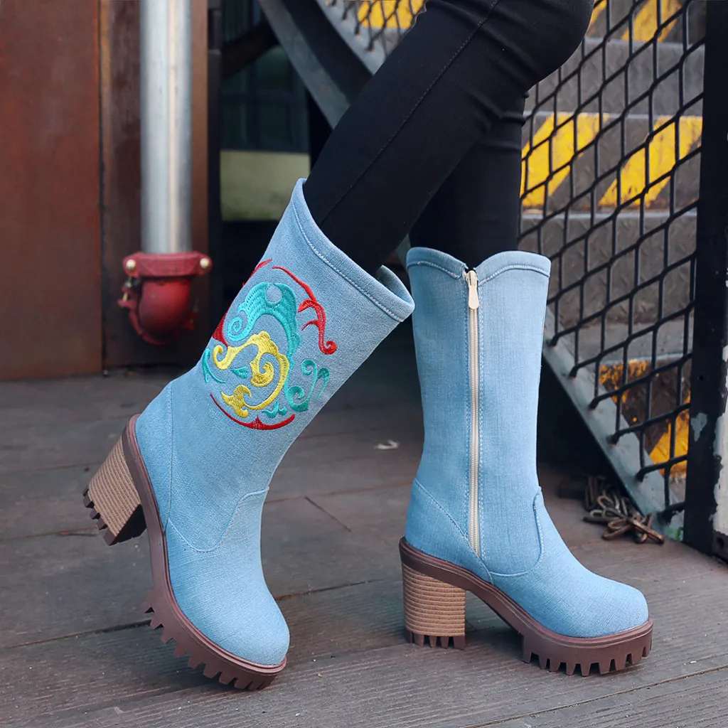 Женская джинсовая обувь на толстом каблуке с круглым носком; Западный рыцарь; Ботильоны средней длины