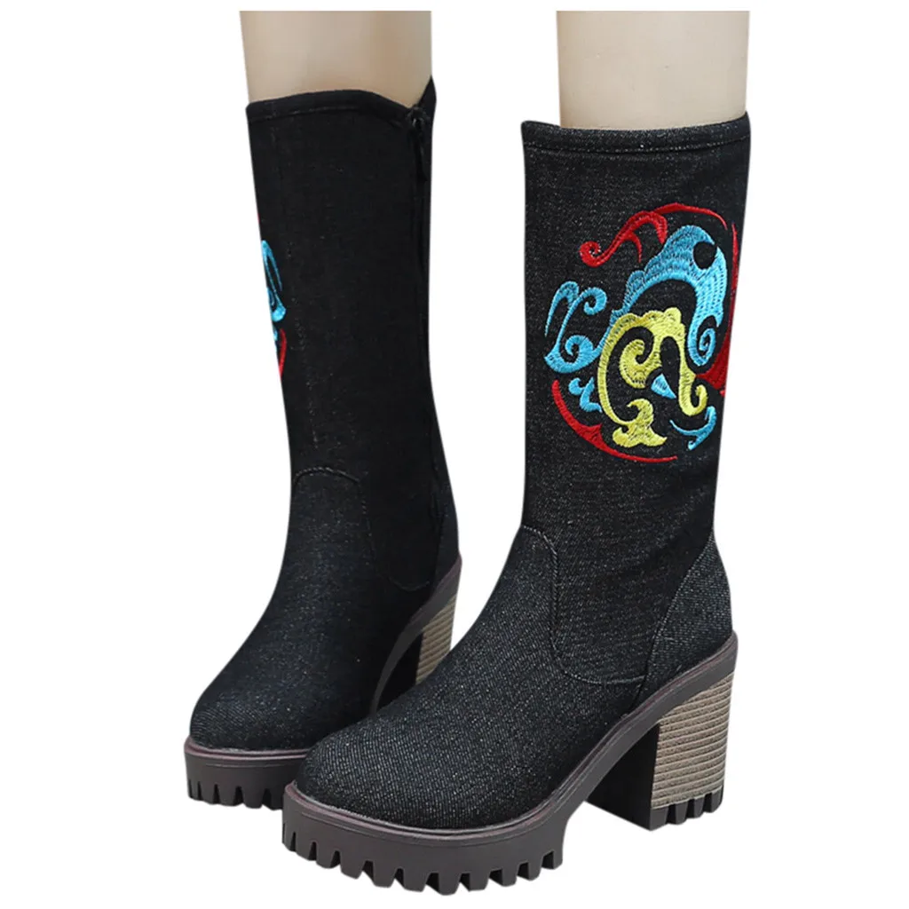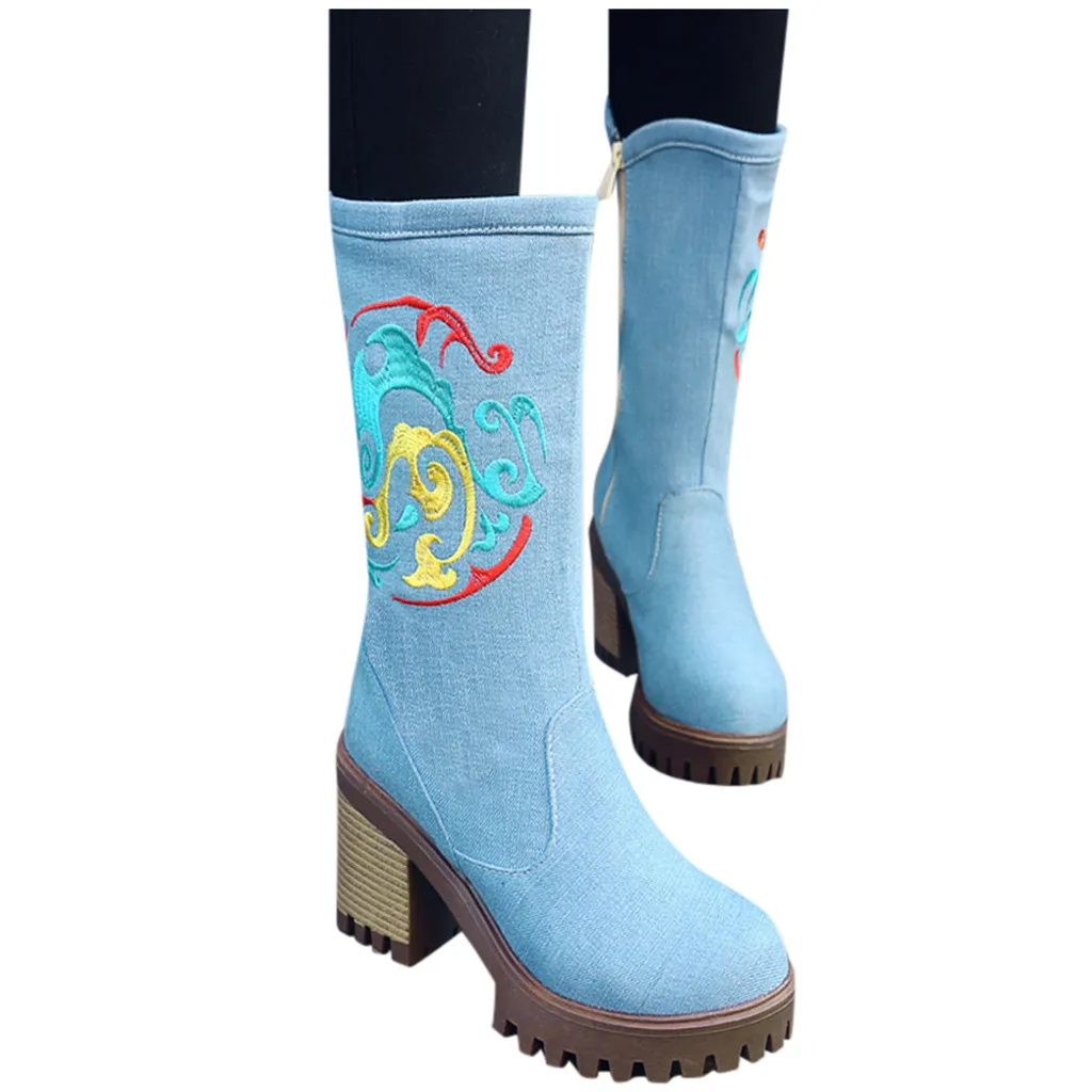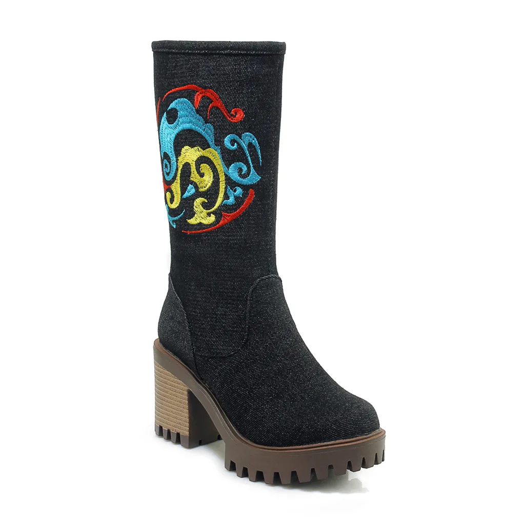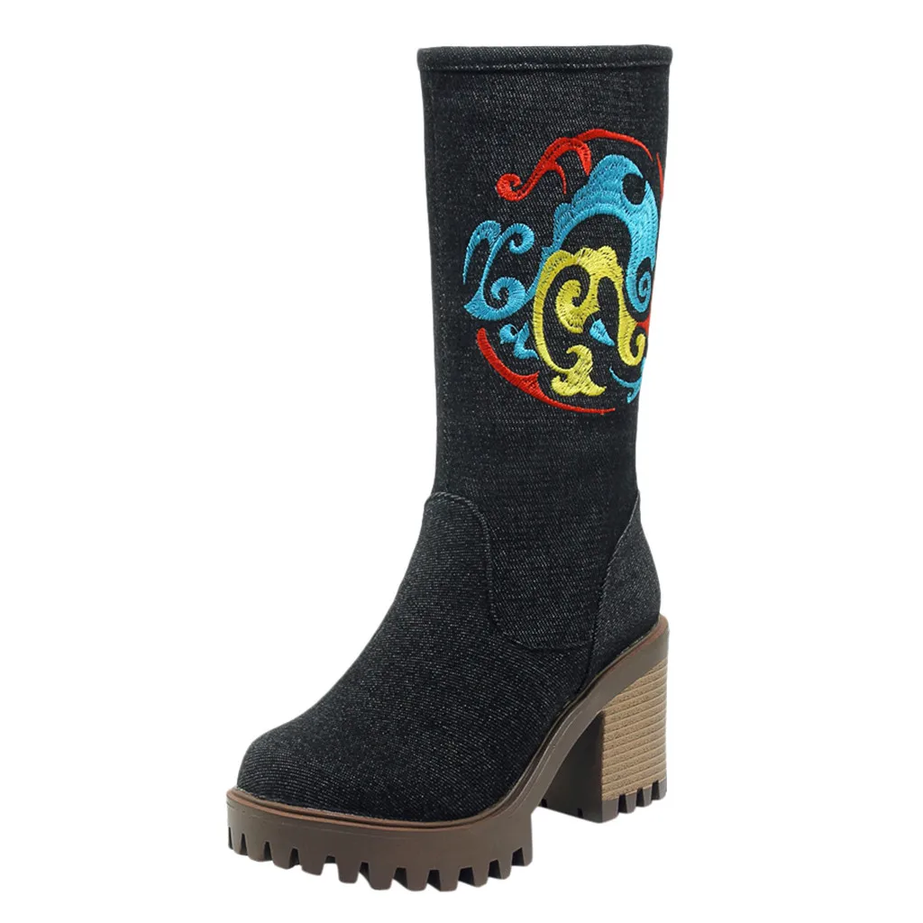 Женская джинсовая обувь на толстом каблуке с круглым носком; Западный рыцарь; Ботильоны средней длины