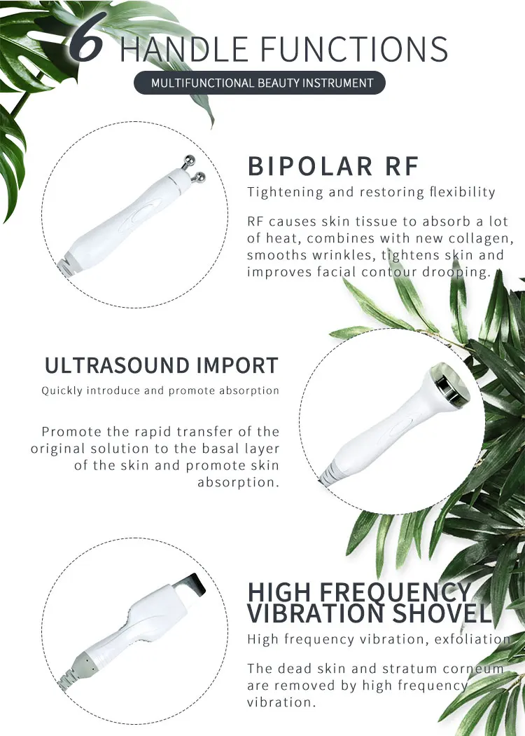 Формируя вакуумное всасывание, микро воздушные пузырьки смешиваются с питательной средой, через специально разработанный спиральный наконечник непосредственно работает на коже, что может удерживать микро пузырьки на ощупь кожи в течение длительного времени, очистите и вытрите омертвевшие клетки в супертонких слоях кожи. Благодаря вакуумному всасыванию микропузырьки могут удалять любые загрязнения и мертвые частицы кожи, шрамы, пятна, обеспечивает длительное питание кожи, делает кожу более влажной и гладкой.