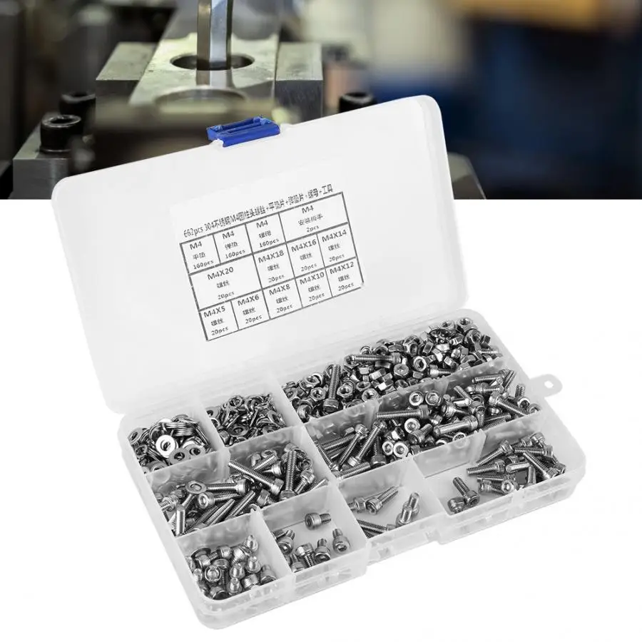 662 шт M4 винт набор 304 нержавеющая сталь болт с цилиндрической головкой + плоская/эластичная шайба + гайка