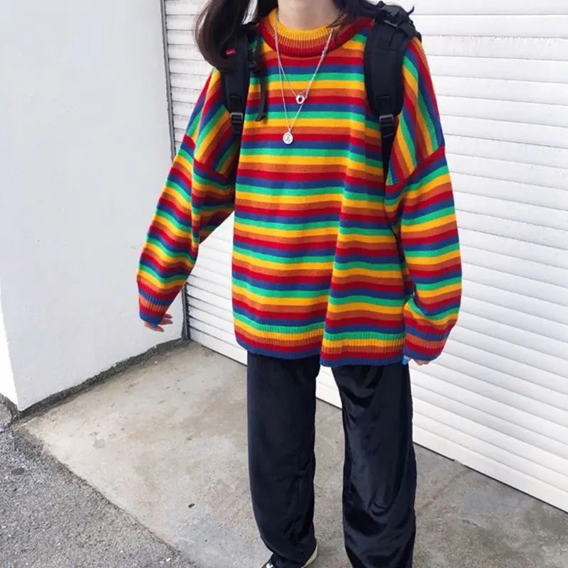 Long sleeves, round neckline, casual pullover style, oversized loose fit, harajuku punk style, rainbow horizontal stripes printing.