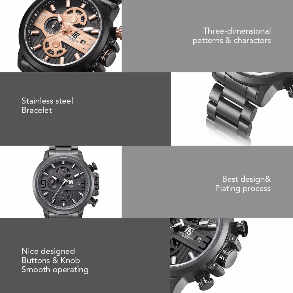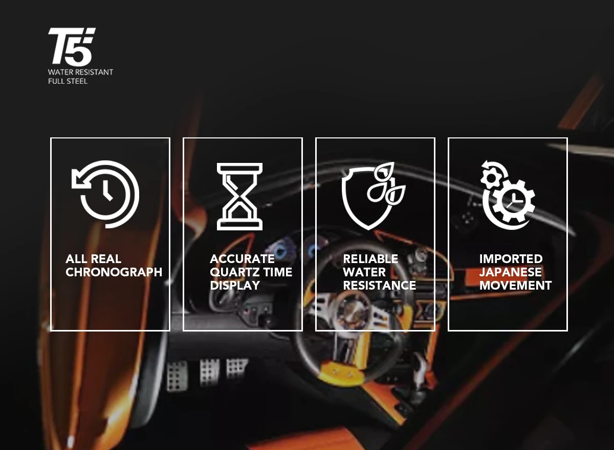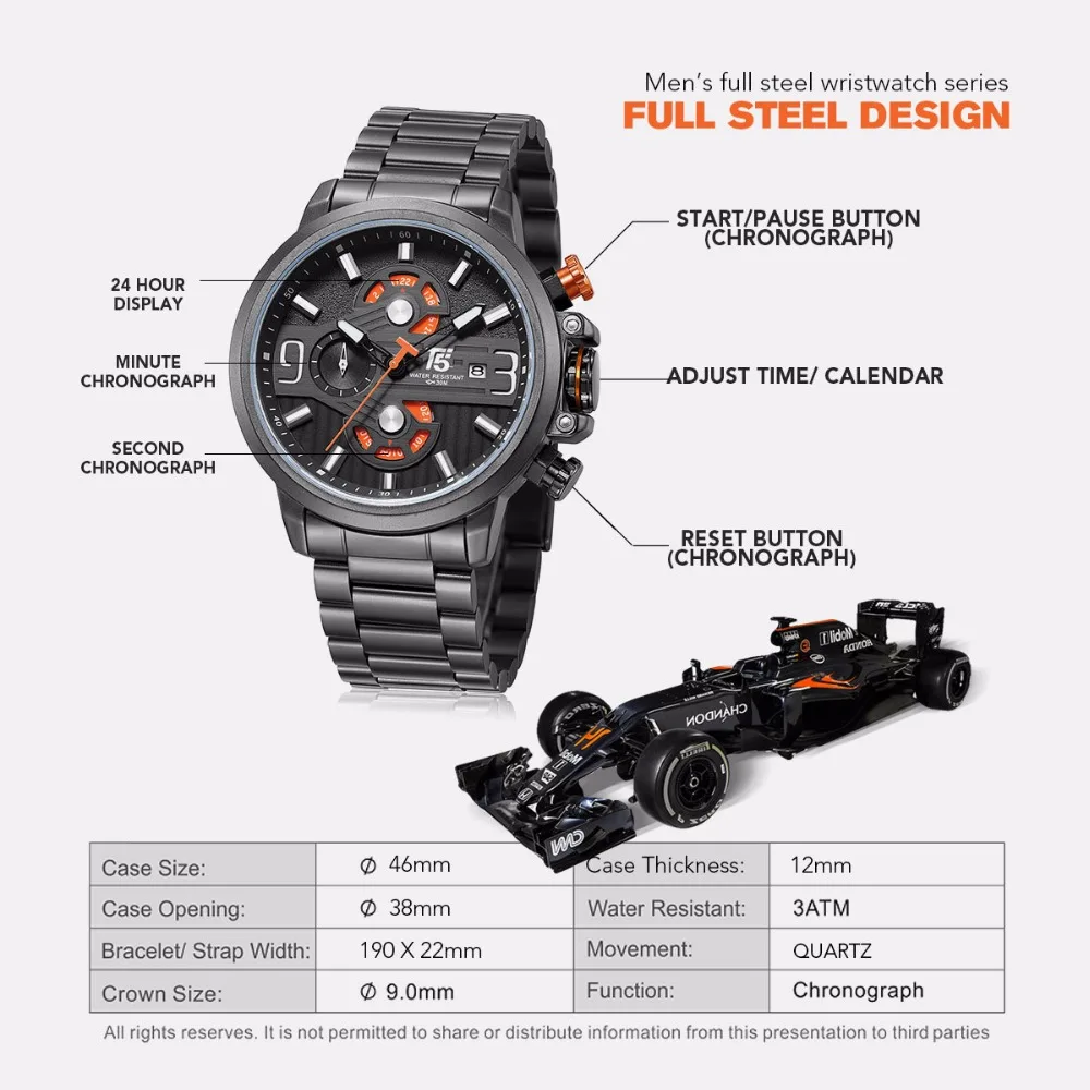 Особенности: Водонепроницаемость 30 м, настоящий хронограф, ударопрочный, можно плавать в воде