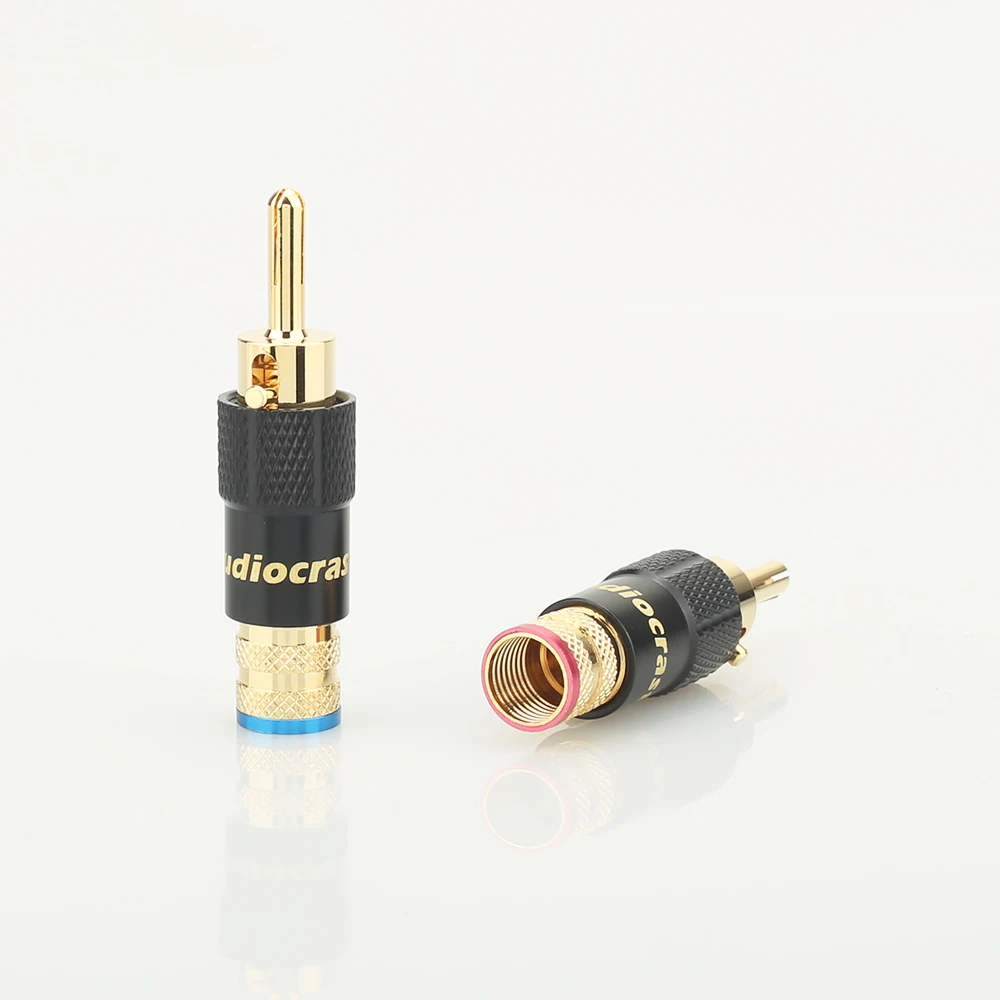 Audiocrast 24K Gold Plated Audio Banana Speaker Plug Screw Lock 10mm Cable Wire Connector High Quality 100% Brand new! Package:Blue +Red half Rhodium plating for maximum signal transfer & durability Material : brass inner plug Double screws locking. No Need Soldering Fit for wire size up to 10mm Secured with an expandable contact pin