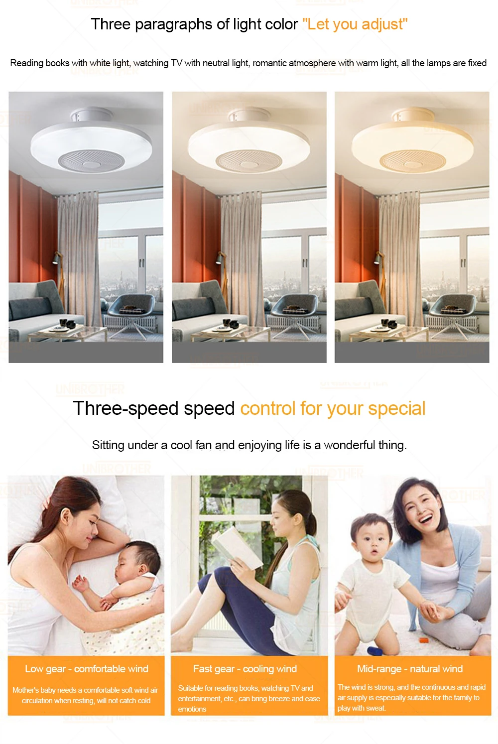 Материал лопасти вентилятора: АБС-пластик Допустимое пространство: 10-30 квадратных метров Мощность двигателя: 40 Вт Источник питания: светильник, 72 Вт Светильник soucrce: светодиодный, трехцветный (белый, желтый, белый, нейтральный) Посылка Размер: 54*54*35 см Вес брутто: 4,3 кг Область применения: спальня, гостиная, кабинет, детская комната