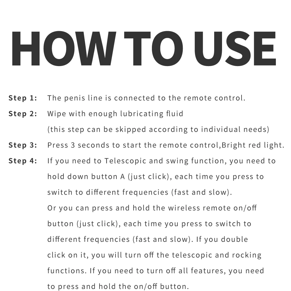 1. Материал: Медицинский силикон 2. Особенности: расширение/вибрация/качели/горячий фаллоимитатор. 3. Вы обнаружите, что силиконовый фаллоимитатор настолько реальен, когда получите его. Мягкий Цельный силиконовый материал делает его таким великолепным, таким реальным в руке. 4. Огромный фаллоимитатор, превосходный по размеру, отлично стимулирует женскую точку G. 5. Реалистичный фаллоимитатор разработан с сильной присоской, которая позволяет вам отпустить руки и легко достичь оргазма. 6. Наш фаллоимитатор на присоске изготовлен из медицинского силиконового материала, нетоксичный, без запаха. 100% водонепроницаемый материал гарантирует, что вы можете использовать его во влажной среде. Примечание: 1. Очистите изделие до и после использования, промойте теплой водой и антибактериальным мылом, аккуратно протрите полотенцем или мягкой тканью. 2. Перед использованием добавьте капельку или два ваших любимых сексуальных блеска в фаллоимитатор.