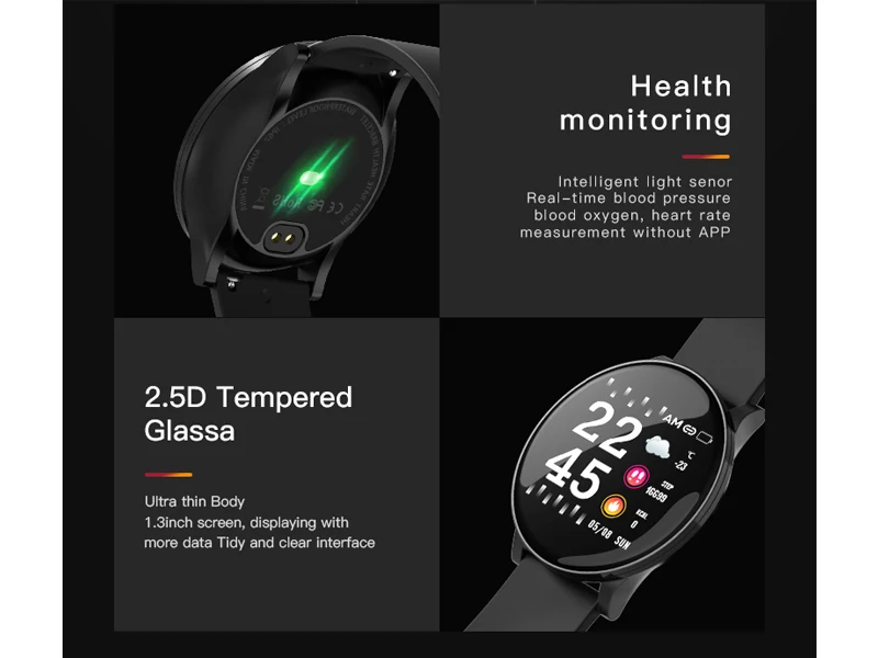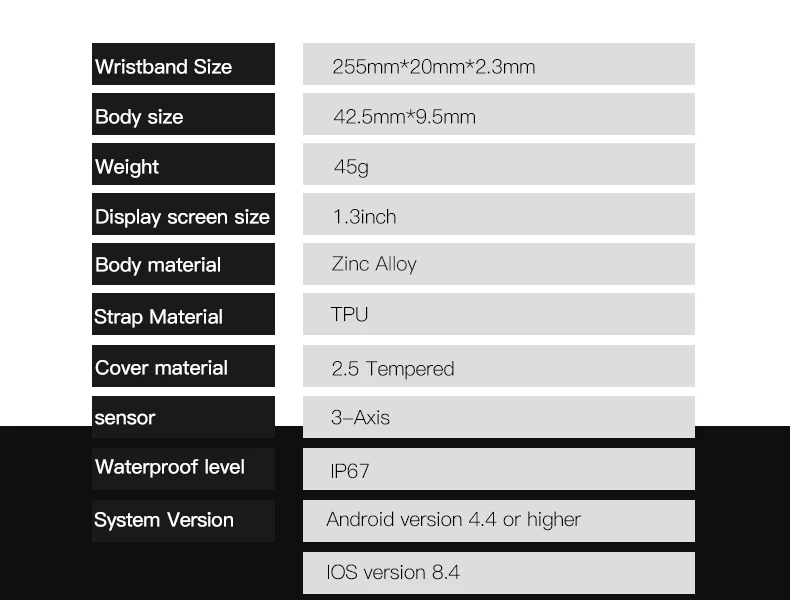 Параметры: Цвет: черный, розовый, серый Размер ремешка: 255x20x2,3 мм/10,04x0,79x0,09'' Размер Fuselage: диаметр 42,5x9,5 мм/1,67x0,37'' Вес: 44 г Размер экрана: 1,3 дюйма Разрешение 240*240 Ёмкость: 170 мА-ч Верхняя крышка: стекло Fuselage: Гальваническое покрытие из цинкового сплава Ремень: термопластичный полиуретан Аппаратного обеспечения высокой интенсивности параметры: Процессор: Hs6620D Частота сердечных сокращений: wk1070 Оперативная память: 128kb Флэш-память: 1 м G-сенсор: 3 оси Bluetooth: встроенная антенна BT Зарядное устройство интерфейс: сенсорный экран Ключ: одним нажатием кнопки Водонепроницаемый уровень: IP67 Для Android версии: 4,4 + Для версии Apple: 8,4 + Функция программного обеспечения: Отображение времени: Поддержка Шагомер: Поддержка Калорий: Поддержка Расстояние: Поддержка Спортивный режим: Поддержка Ручной подъемный световой экран: Поддержка Монитор наблюдения за сном: Поддержка Беговая дорожка с сборным механизмом: Поддержка Функция напоминания о входящих звонках: Поддержка Напоминание: Поддержка Функция напоминания о сидячем положении: Поддержка Напоминание: Поддержка Не беспокоить режим: поддержка Встряхивание для фото: Поддержка Найти браслет: Поддержка Циферблат переключения: Поддержка Долгое время нажмите touch: Поддержка Погода: Поддержка Быстрое удаление экрана: Поддержка Циферблат на английском китайском языке: Поддержка Измерение цельной точки: Поддержка WeChat спортивные: Поддержка Частота сердечных сокращений: Поддержка Непрерывный Пульс: не поддерживает Приборы для измерения артериального давления: Поддержка Датчик содержания кислорода в крови: Поддержка ЭКГ: не поддерживается Температура тела: не поддерживается Для здоровья Apple: Поддержка Здоровье еженедельно: Поддержка Имя Bluetooth: поддержка Язык: Поддержка Название приложения: Wearfit2.0 Зарядка: зарядка клип Обновление OTA: Поддержка Примечание: В связи с различиями мониторов и эффектами освещения реальный цвет товара может немного отличаться от цвета на фотографиях. Спасибо! Допускается отклонение в 1-3 мм из-за ручного измерения. Упаковка pureglas Умные часы-1 шт. 1 x кабель для зарядки Руководство пользователя-1 шт.;