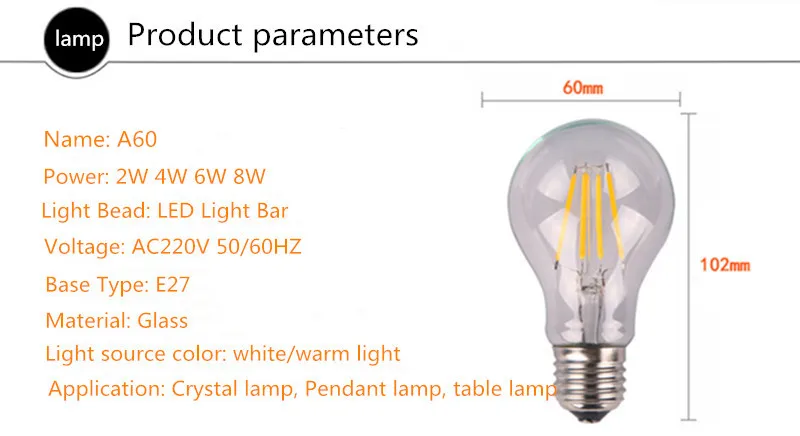 Модель: C35/C35L/A60/ST64 Тип цоколя: E27/E14 Мощность: 2 Вт/4 Вт/6 Вт/8 Вт/12 Вт Светодиодный нити Кол-во: 2 шт./4 шт./6 шт./8 шт. (1 шт. светодиодный филаментом герметично 1 Вт Мощность только) Цветовая температура: теплый белый 2700-3500K Напряжение: AC 220 V-240 V Ультратонкое естественное освещение CRI: 80Ra Угол пучка: 360 ° Материал: Стекло Средний срок службы:> 50000 часов