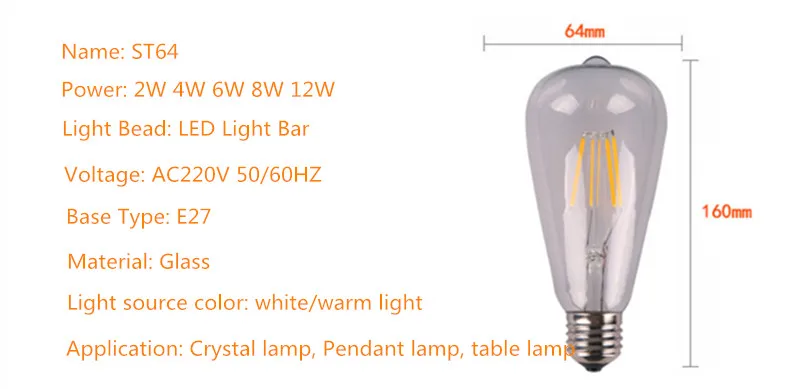 Ретро светодиодный дизайн Светодиодный светильник, без вю и ИК-излучения. Длительный срок службы, высокая эффективность освещения. Энергосбережение, низкое тепло и низкое энергопотребление. Большое уменьшение выбросов углерода, экологически чистый. С традиционным дизайном лампы накаливания, его легко принять обычные люди. Наполненный специальный газ, тепло внутри вакуумной обработанной лампы накаливания может быть эффективно исключено. С углом луча 360 ° лампочка накаливания может выдать свет всенаправленный. Принимает драйвер постоянного тока IC, лампа накаливания обладает стабильной производительностью и длительным сроком службы Не содержит свинец, ртуть и другие элементы загрязнения. Подходит для залов, баров, офиса или домашнего использования.