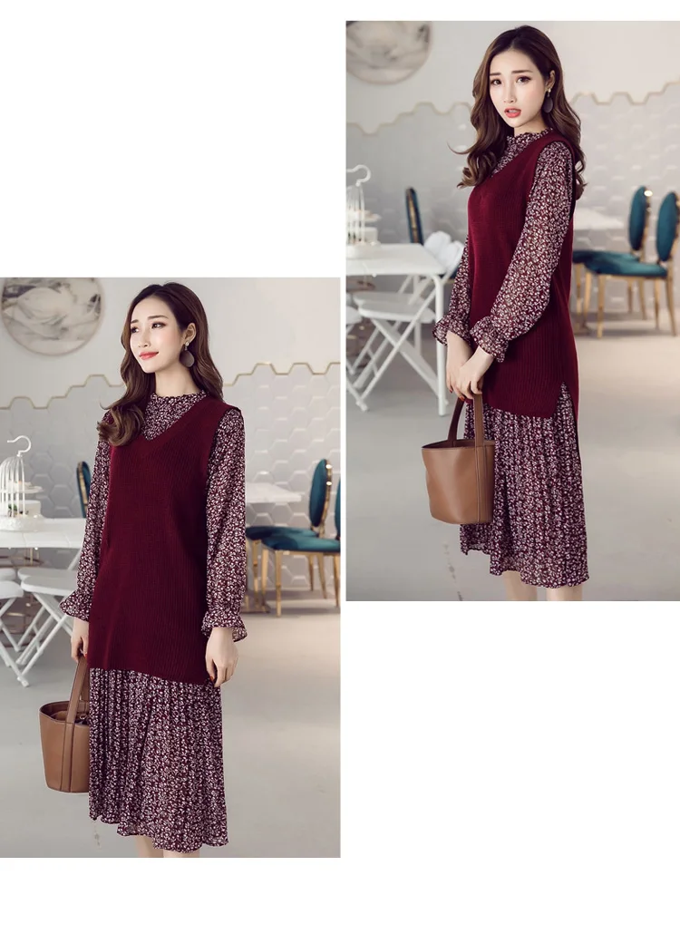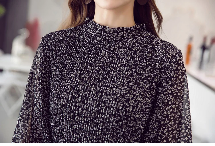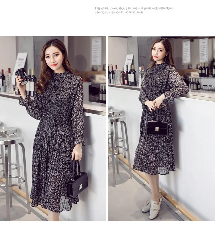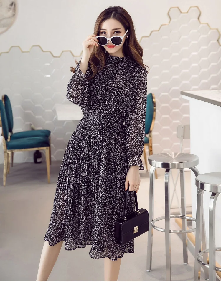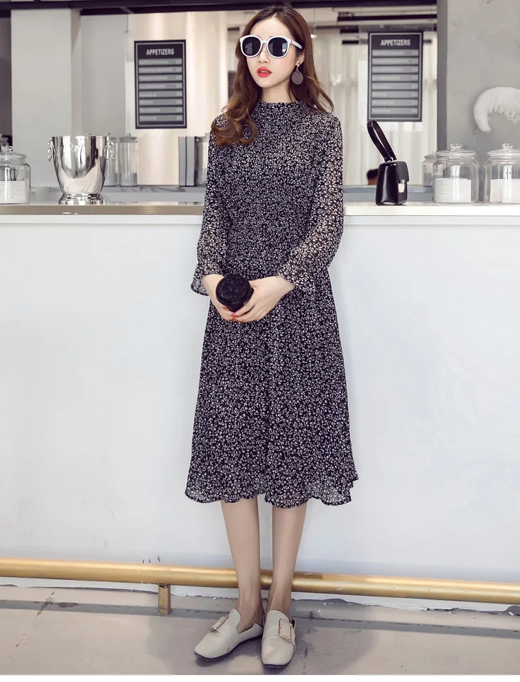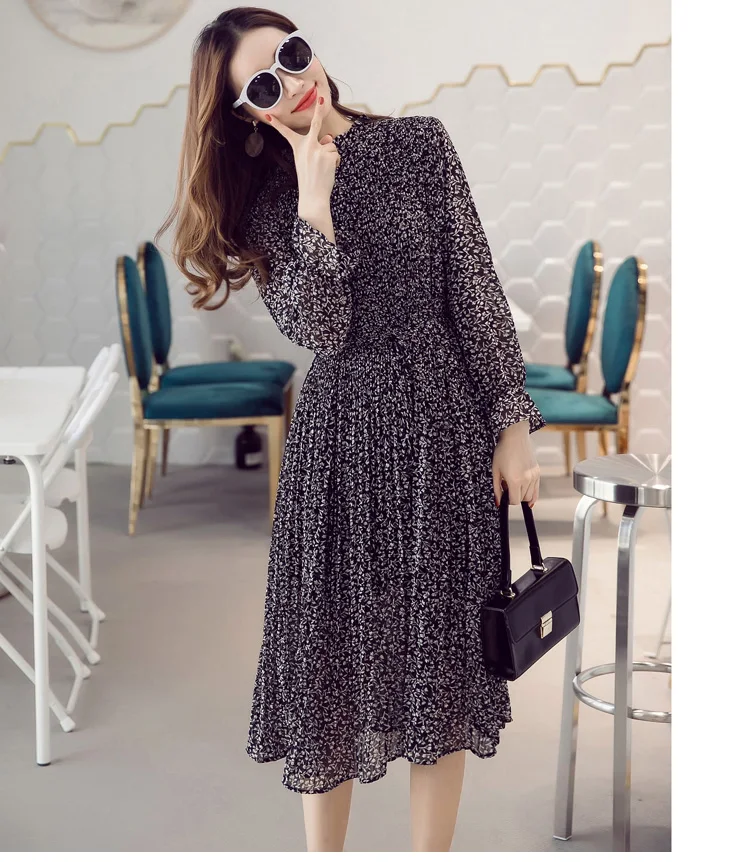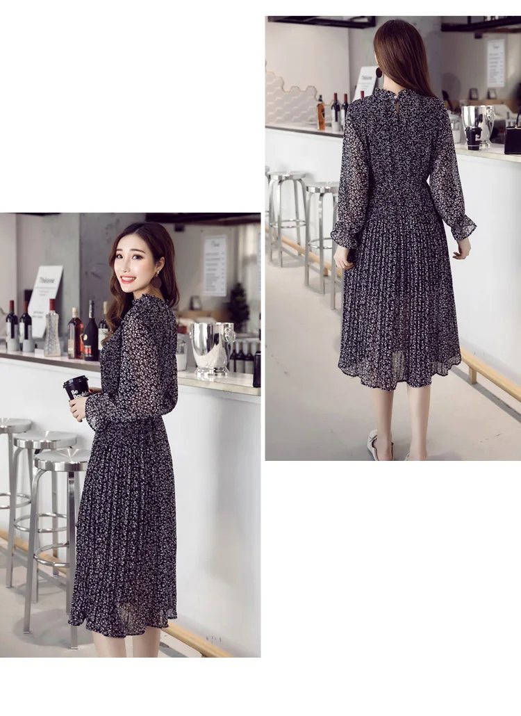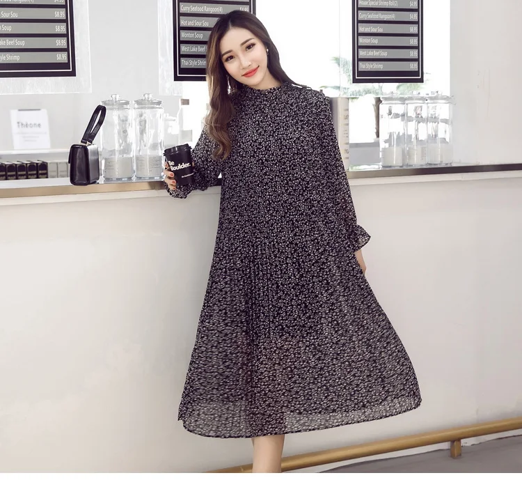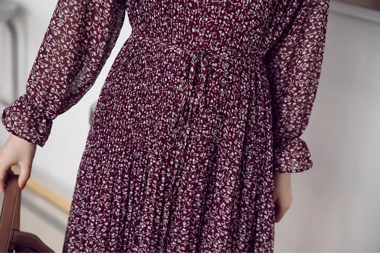 Chiffon Bohemian Dress Autumn Loose Pleated Dresses Women A-line F1er Print Floral Dot Female Vestidos Plus Size DC996