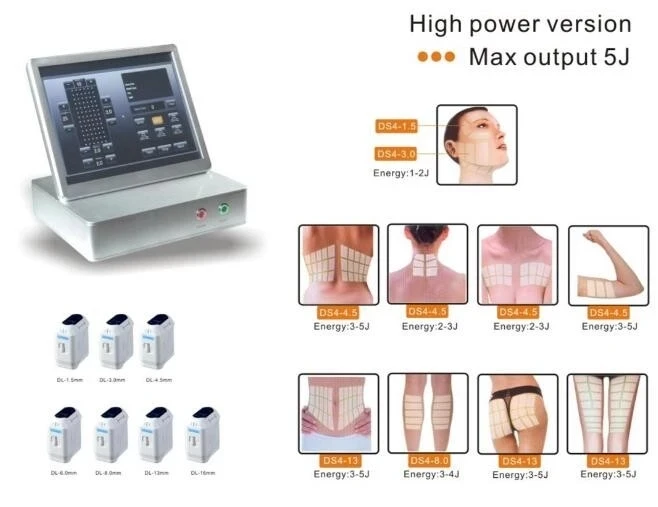 Ультразвук достигает слоя SMAS с его спецификой улучшает суспензию SMAS, всесторонне решает проблемы провисания и релаксации лица. Он точно позиций в сверхзвуковая мощь на SMAS 4,5 мм под кожу, достижения лучшего эффекта формирования, вытягивания и уплотнения для роста мышцы и отличное сцепление воздействие на коллаген слой 3 мм под кожу, коллаген изменен и новорожденный, решение проблем старения путем восстановления эластичности, отбеливания кожи, Удаление морщин и сужение пор. Нет необходимости беспокоиться о травме кожи, потому что сила находится на эпидермисе. Кроме того, он имеет функции быстрого вытягивания, счетчика уплотнения и быстрого разглаживания морщин.
