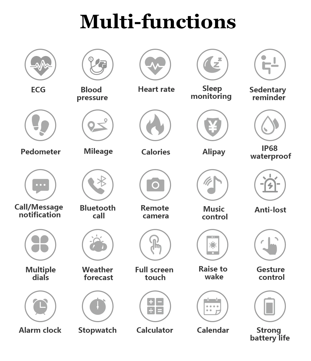 Большая память, более 10 Выбор циферблата, клавиатура для набора (Bluetooth Вызов), информация, телефонная книга, записи звонков, подключение по Bluetooth, шаги, мониторинг сна, напоминание о сидячем состоянии, частота сердечных сокращений, bluetooth музыка, удаленная фотография, уведомления, калькулятор, будильник, календарь, секундомер, многоязычный, Alipay.