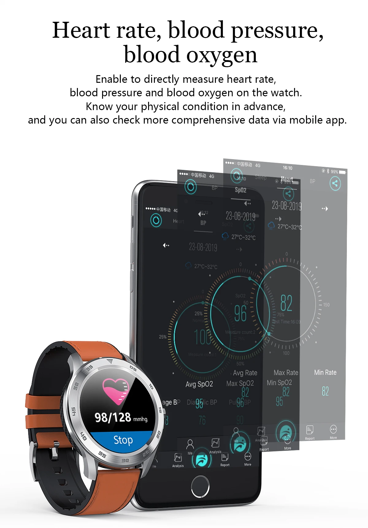 ●Используйте оптическую технологию пульса и ECG комбинировать, около 30 секунд может показать дату, после тестирования будет apear ToApp, означает ECG данные сохранить на телефон «Fundo».