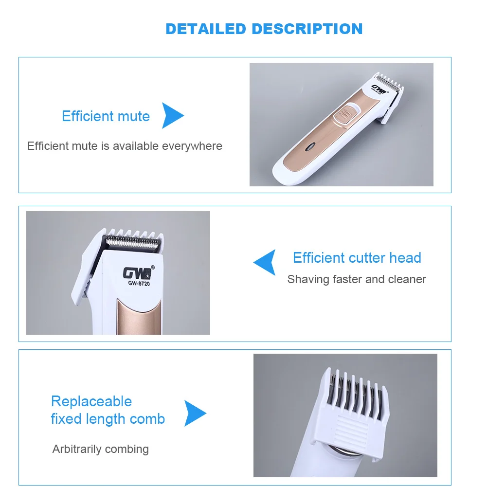 Сильная и стабильная мощность, острая головка ножа, мощная резка, равномерный захват и стрижка волос, быстрая и экономичная, в то же время, контроль шума очень маленький, даже ребенок не проснется