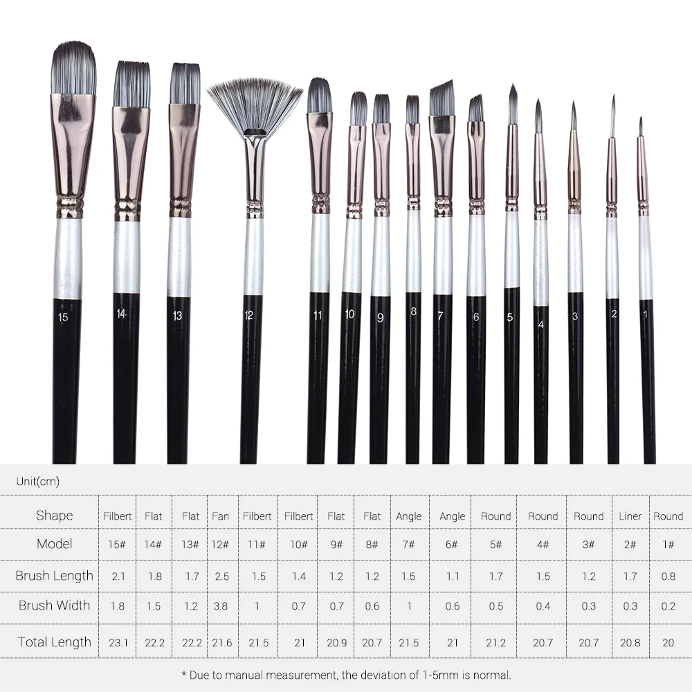 15 кистей для краски различной формы и размера, могут удовлетворить ваши различные потребности в живописи, включая круглые кончики (1 #,3 #,4 #,5 #,)-Наконечник вкладыша (2 #)-Наконечники угла (6 #,7 #)-плоские наконечники (8 #,9 #,13 #,14 #)-Наконечники филберта (10 #,11 #,15 #)-наконечник вентилятора (12 #).