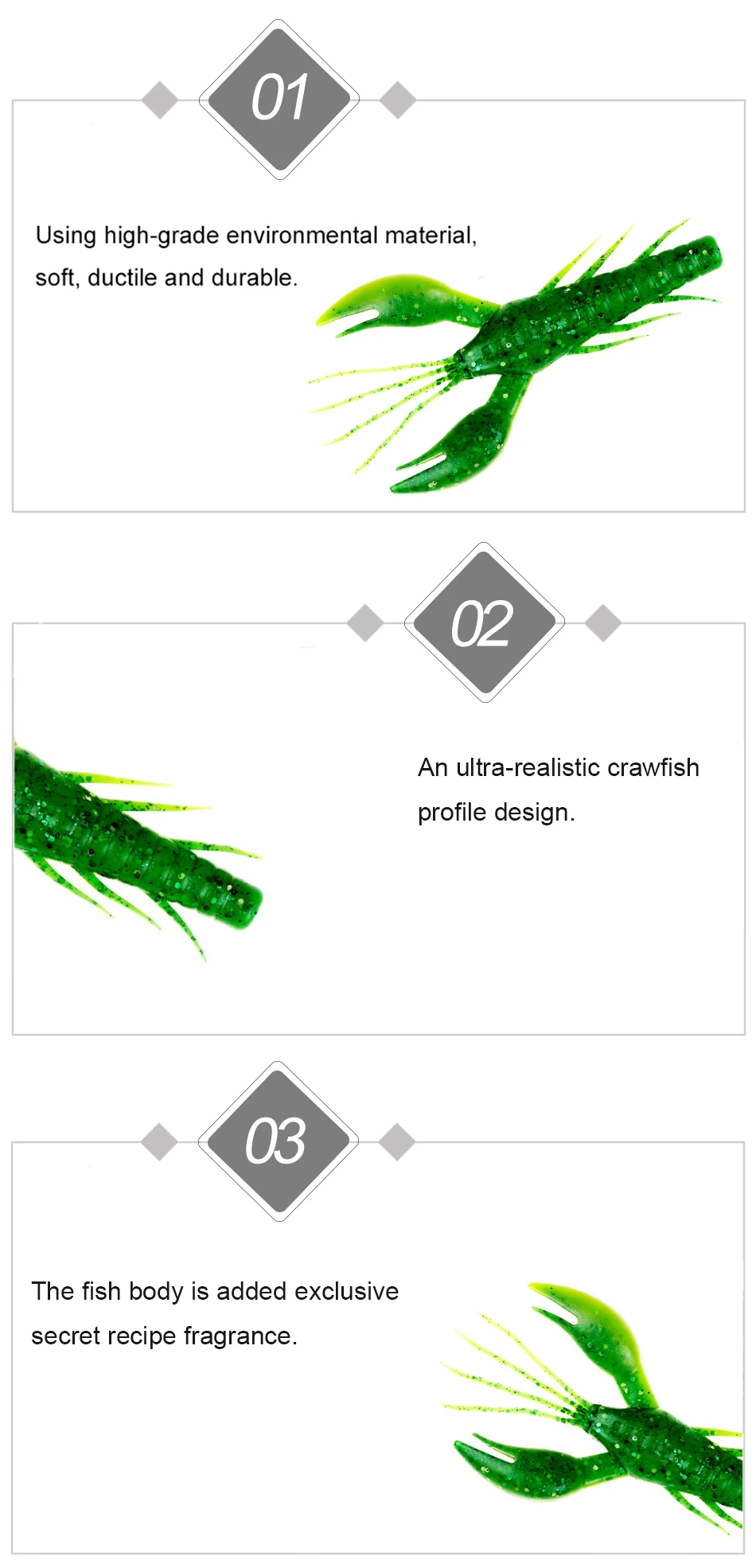 Технические характеристики: 1. Модель: S5499 2. Тип: Мягкая приманка 3. Материал: силикон 4. Вес: 1,6 г 9 г 5. Длина: 60 мм 95 мм 6. Посылка: 6 шт./пакет 3 шт./пакет 7. Запах: Креветочный пигмент Особенности: 1. Используется Высококачественный экологичный материал, мягкий, высокопрочный и долговечный. 2. Сверхреалистичный профиль для раков. 3. К телу рыбы добавляется эксклюзивный секретный ароматизатор по рецепту.