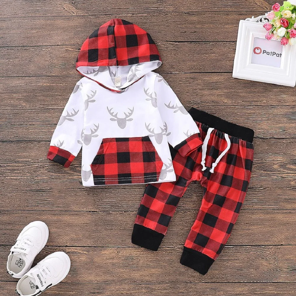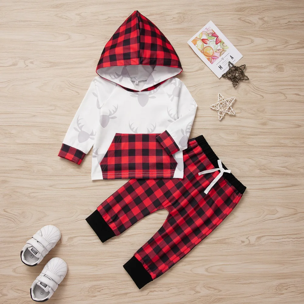 AU/комплект из 2 предметов, Рождественская одежда в клетку для новорожденных мальчиков и девочек, комплект из топа с капюшоном и штанов