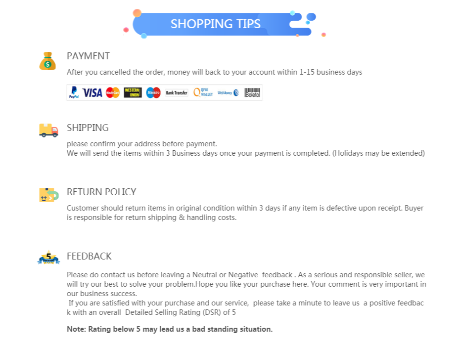 1.Fast Shipping 1-3 Days + Timely Reply + Positive Attitude