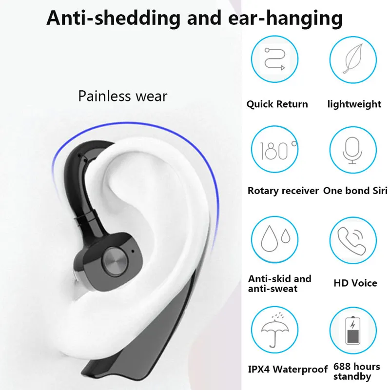 Параметры продукта: Версия Bluetooth: V5.0 + EDR Расстояние передачи Bluetooth: 10 м (без препятствий) Продолжительность вызова: 48 часов Время воспроизведения музыки: 36 часов Время работы в режиме ожидания: 688 часов Время зарядки: 1-2 часа Входное напряжение тока: 5 В/1 А Примечание: Пожалуйста, попробуйте зарядить с зарядной головкой 5 В/1 А, в противном случае будут проблемы, такие как длительное время зарядки или быстрое повреждение батареи. Особенности продукта: Односторонняя деловая гарнитура, подходит для вождения, используется во время занятий спортом Вращающийся на 180 ° наушник, можно носить как левые, так и правые уши Водонепроницаемый и устойчивый к поту, не легко упасть Большой аккумулятор для 36 часов непрерывного воспроизведения музыки Подсказка батареи iOS Автоматическое подключение по Bluetooth Один клик вызова siri/голосовой помощник (Android) Список товаров: Наушники * 1 Зарядный кабель * 1 Руководство по эксплуатации * 1