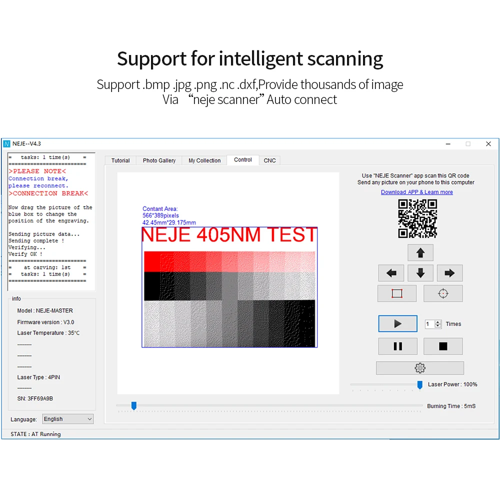 Поддержка приложения «сканер neje», интеллектуальная коллекция и создание, сканирование фотографий, интеллектуальное приложение для автоматической печати подключений. В. JPG или. Фотографии из камеры или альбома, а также отправка фотографии напрямую на программное обеспечение windows и MAC.