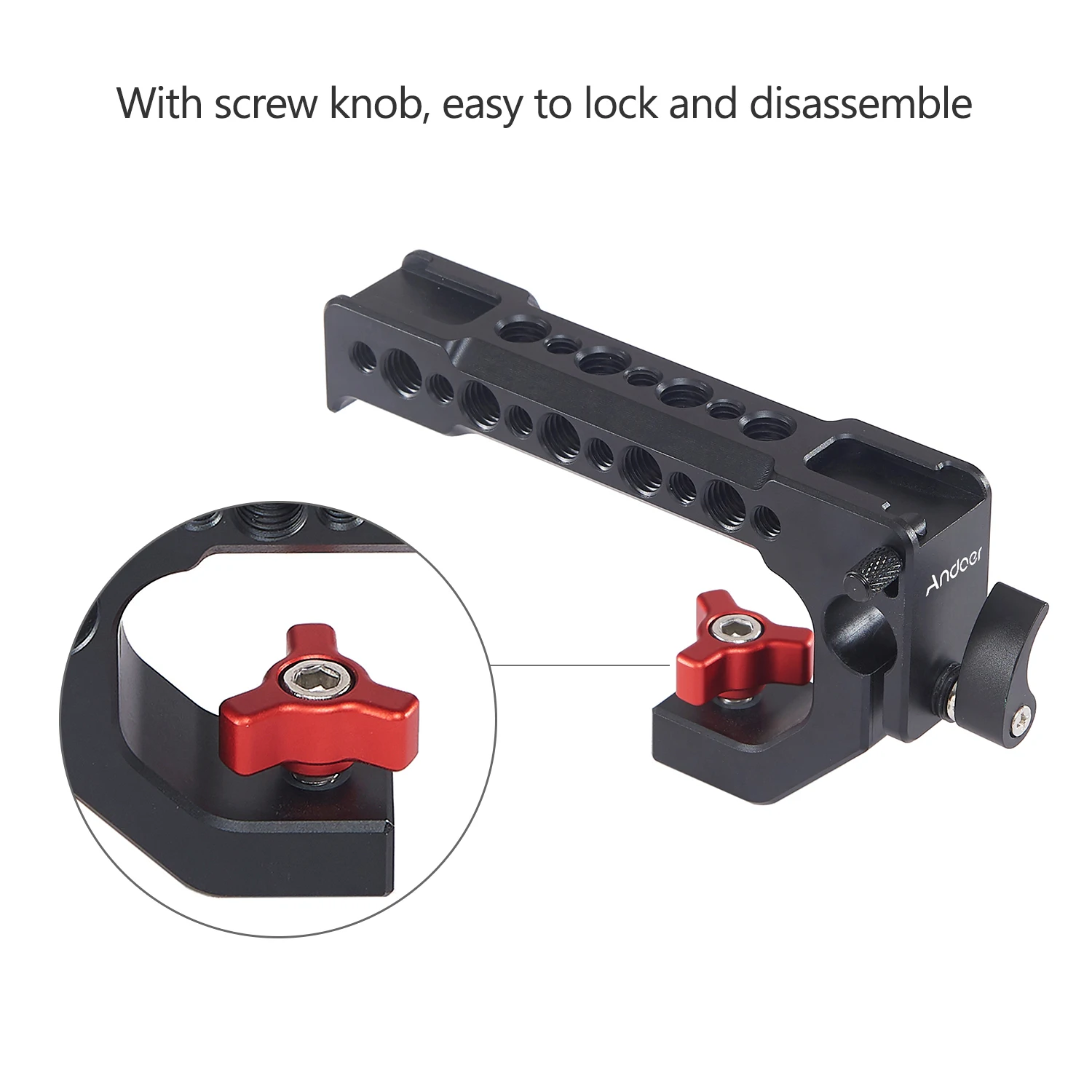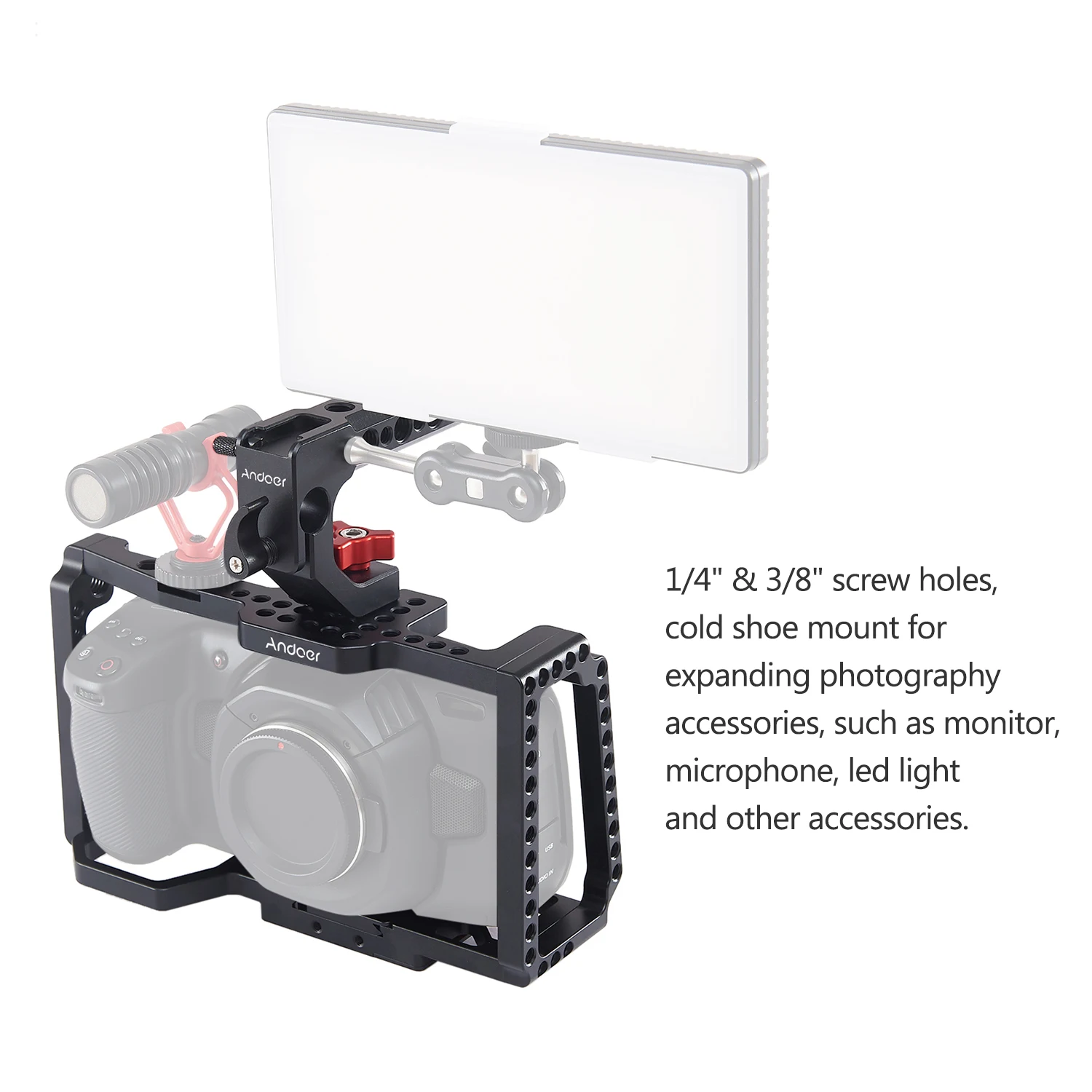 Клетка и верхняя ручка имеют резьбовые отверстия 1/4 дюйма и 3/8 дюйма, крепление для холодной обуви для расширения аксессуаров для фотографии, таких как монитор, микрофон, светодиодный светильник и другие аксессуары. 15 мм отверстие для стержня.