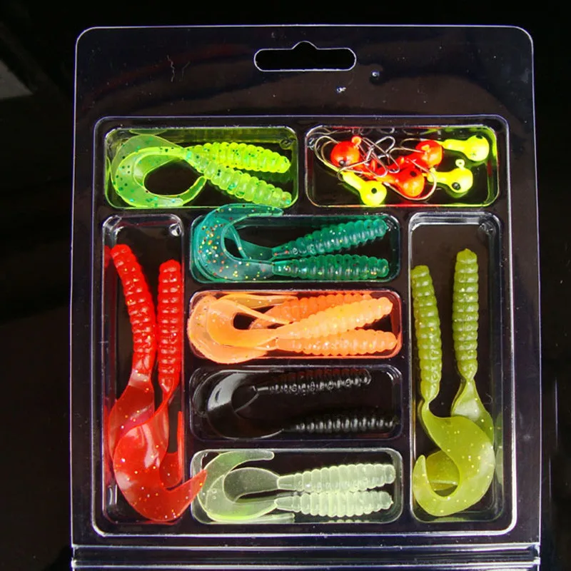 В комплект входит около 28 мягких приманок и 5 крючков для джига маленького размера